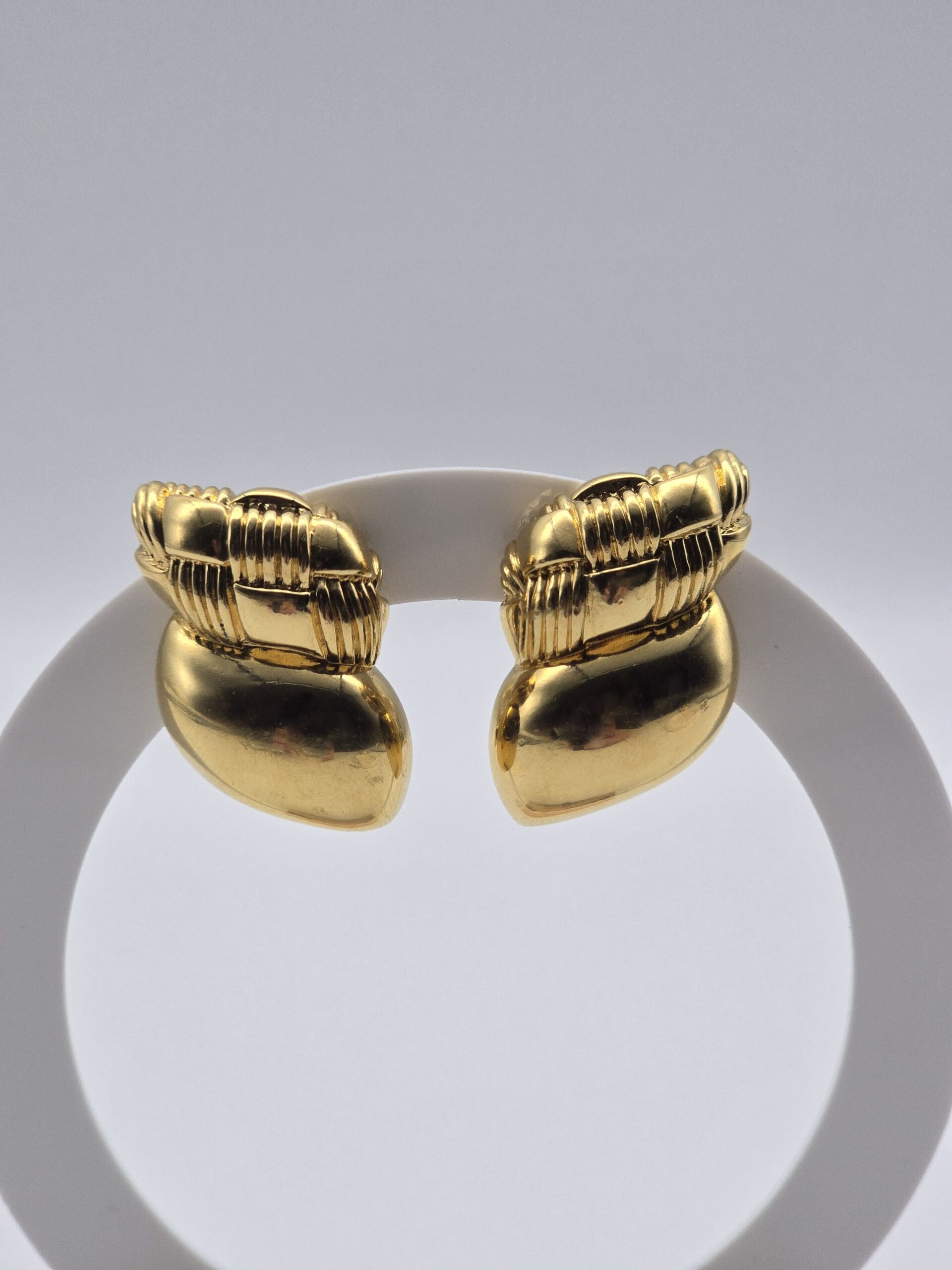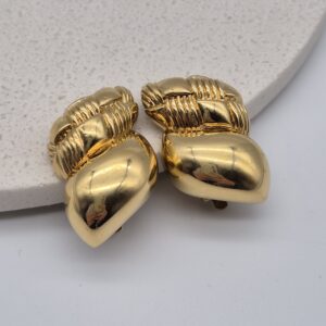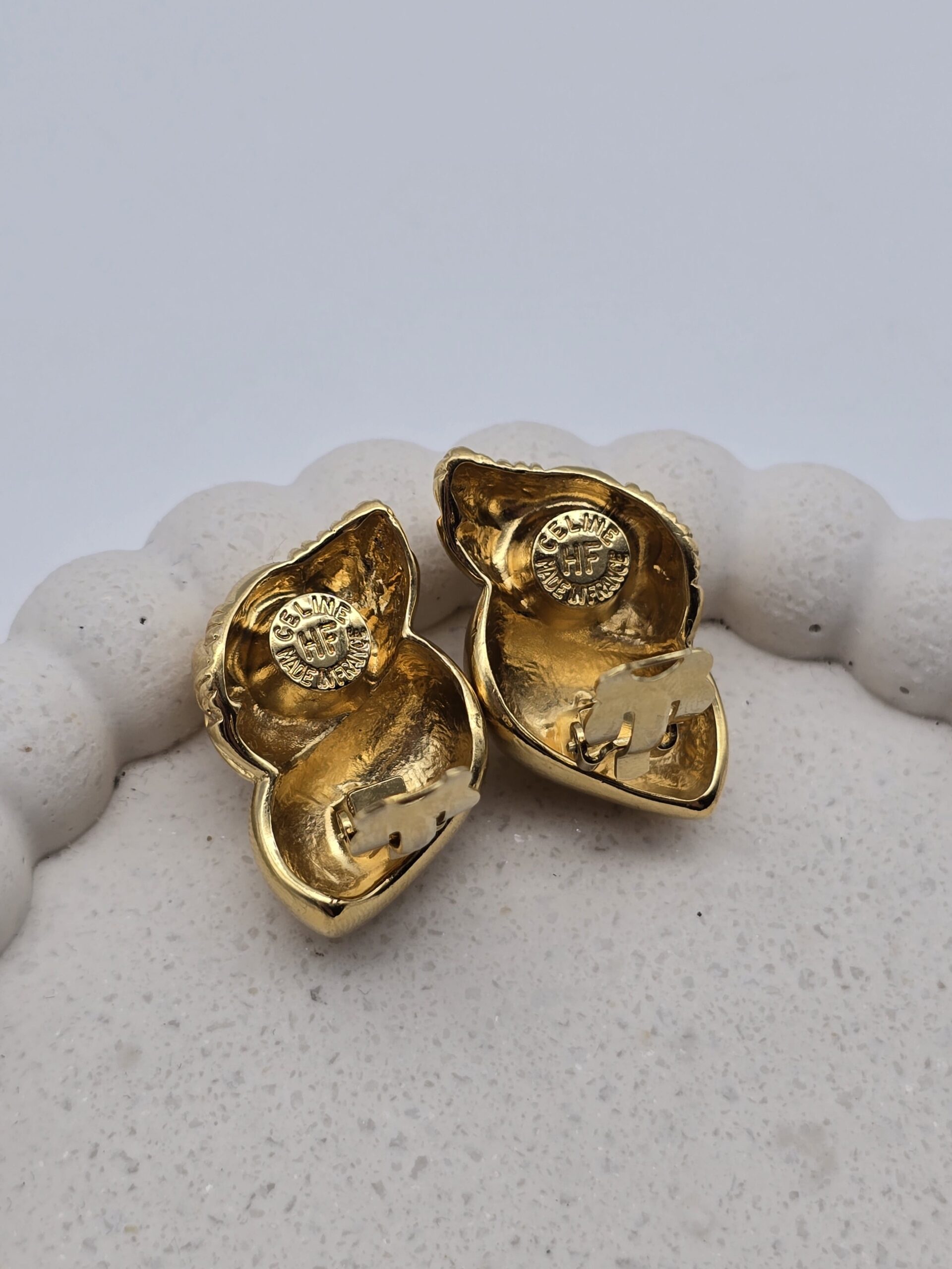 | Wyjątkowe, kolekcjonerskie klipsy Celine wykonane we Francji. Model o niestandardowym, rzeźbiarskim kształcie, w całości pokryty złotem, przyciąga uwagę subtelnym blaskiem i elegancją charakterystyczną dla francuskiego domu mody. Sygnatura „CELINE HF MADE IN FRANCE” potwierdza autentyczność oraz najwyższą jakość wykonania.