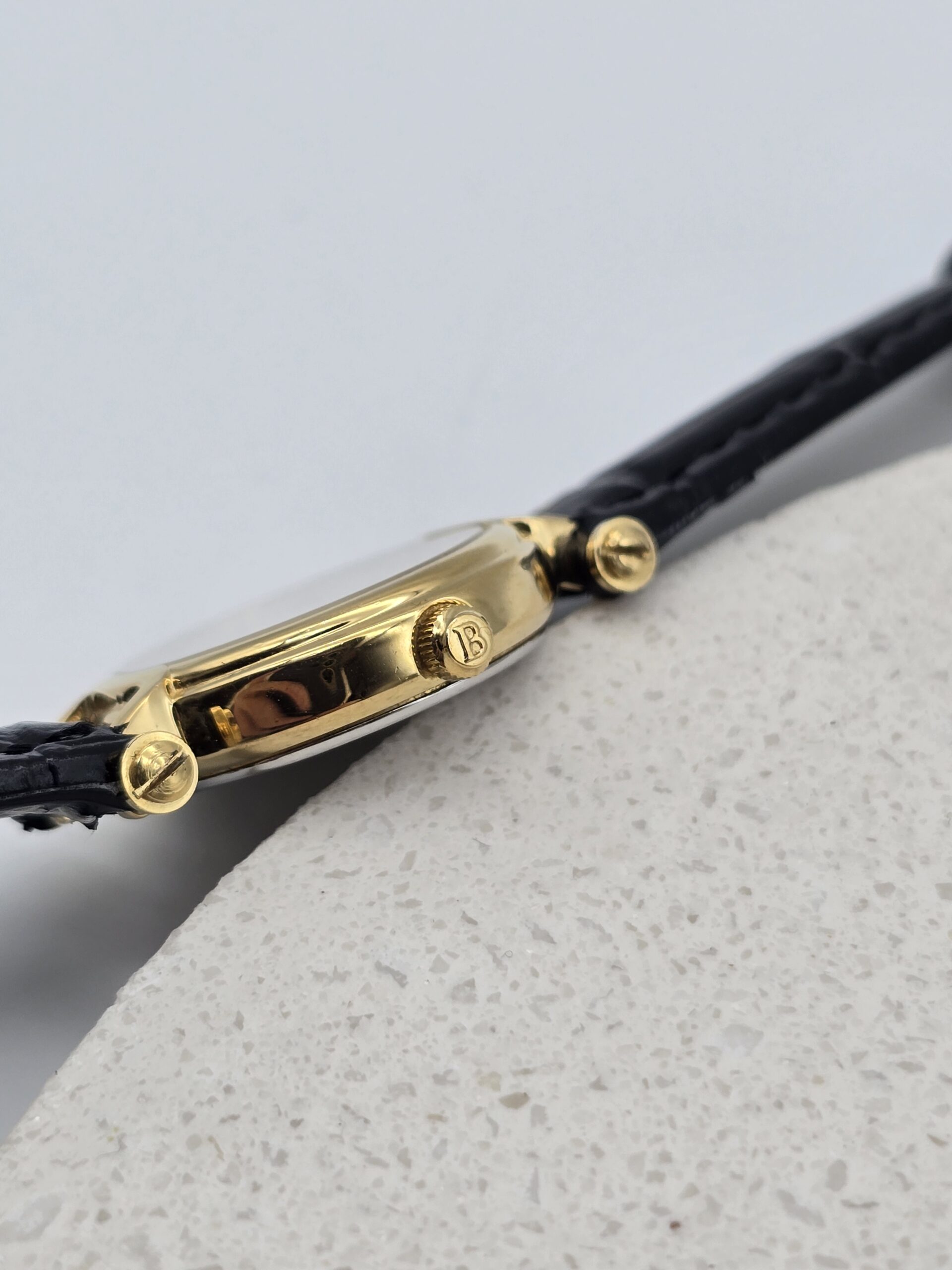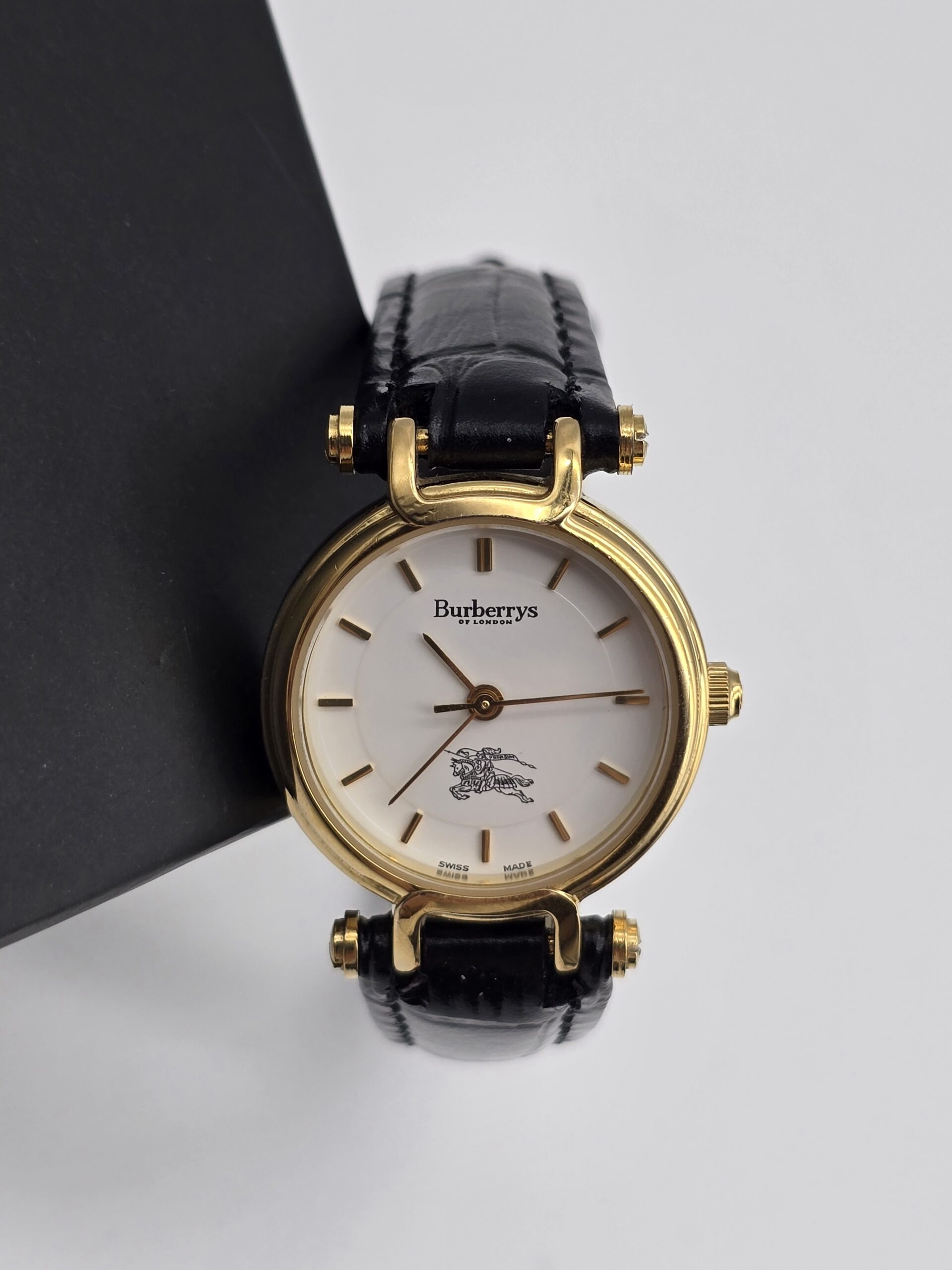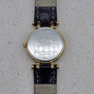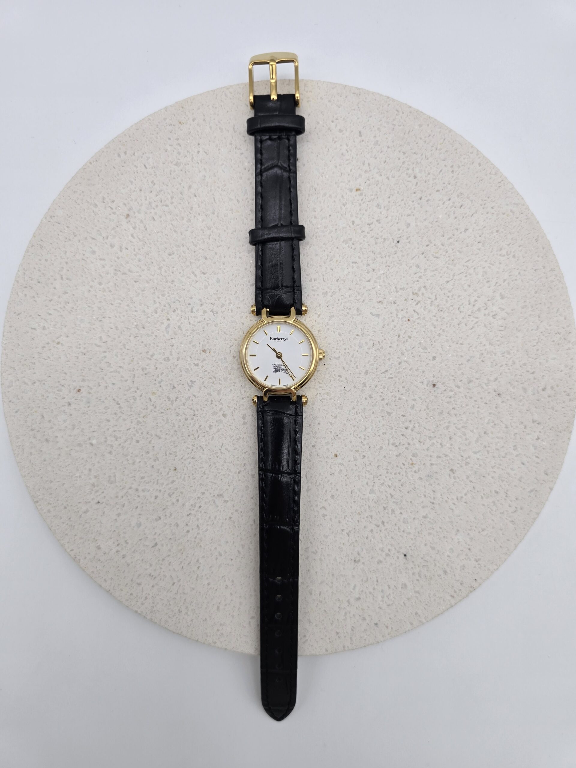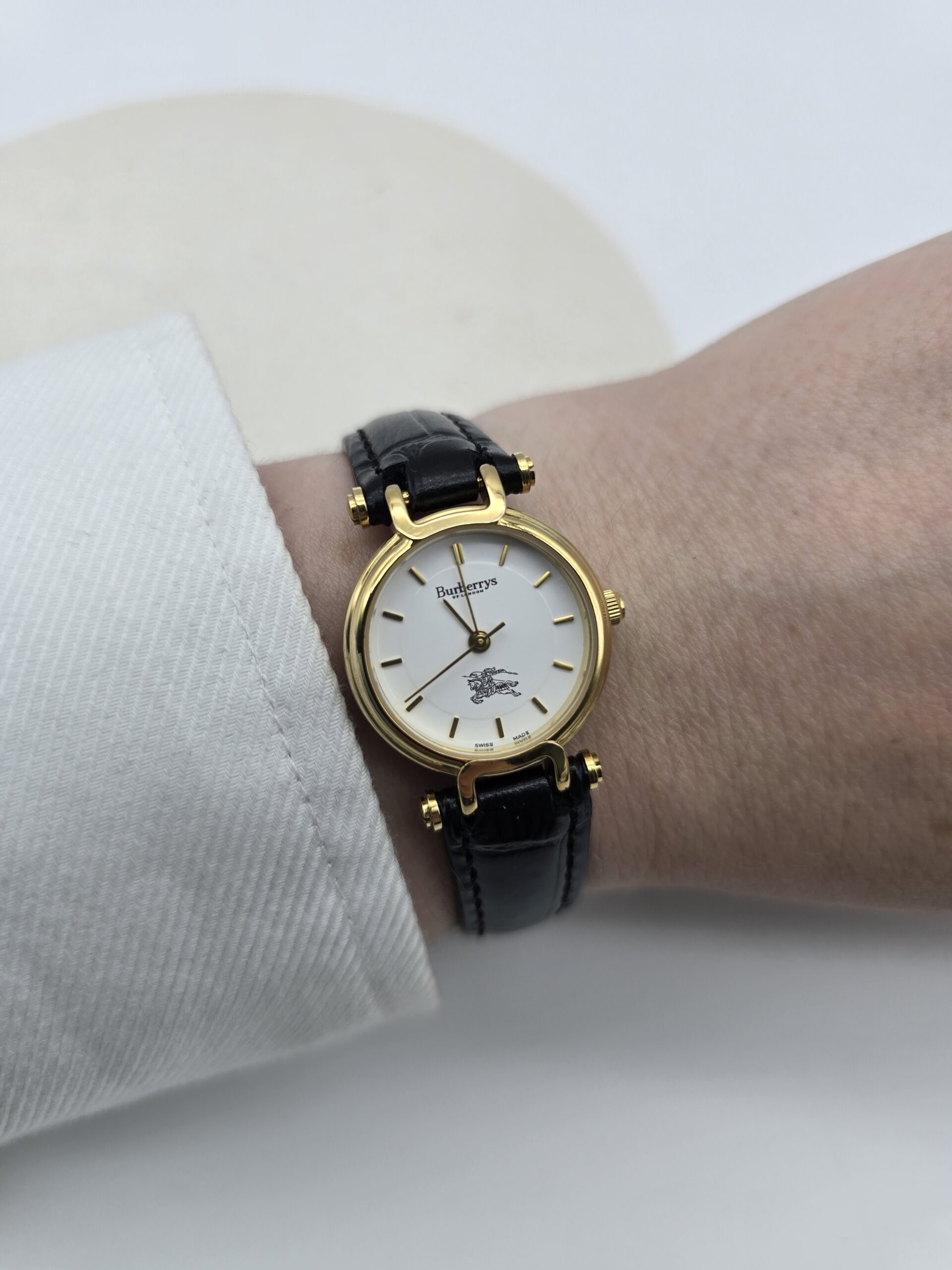 BURBERRY zegarek vintage, złocona koperta 23 mm, biała tarcza, czarny pasek, model 3200