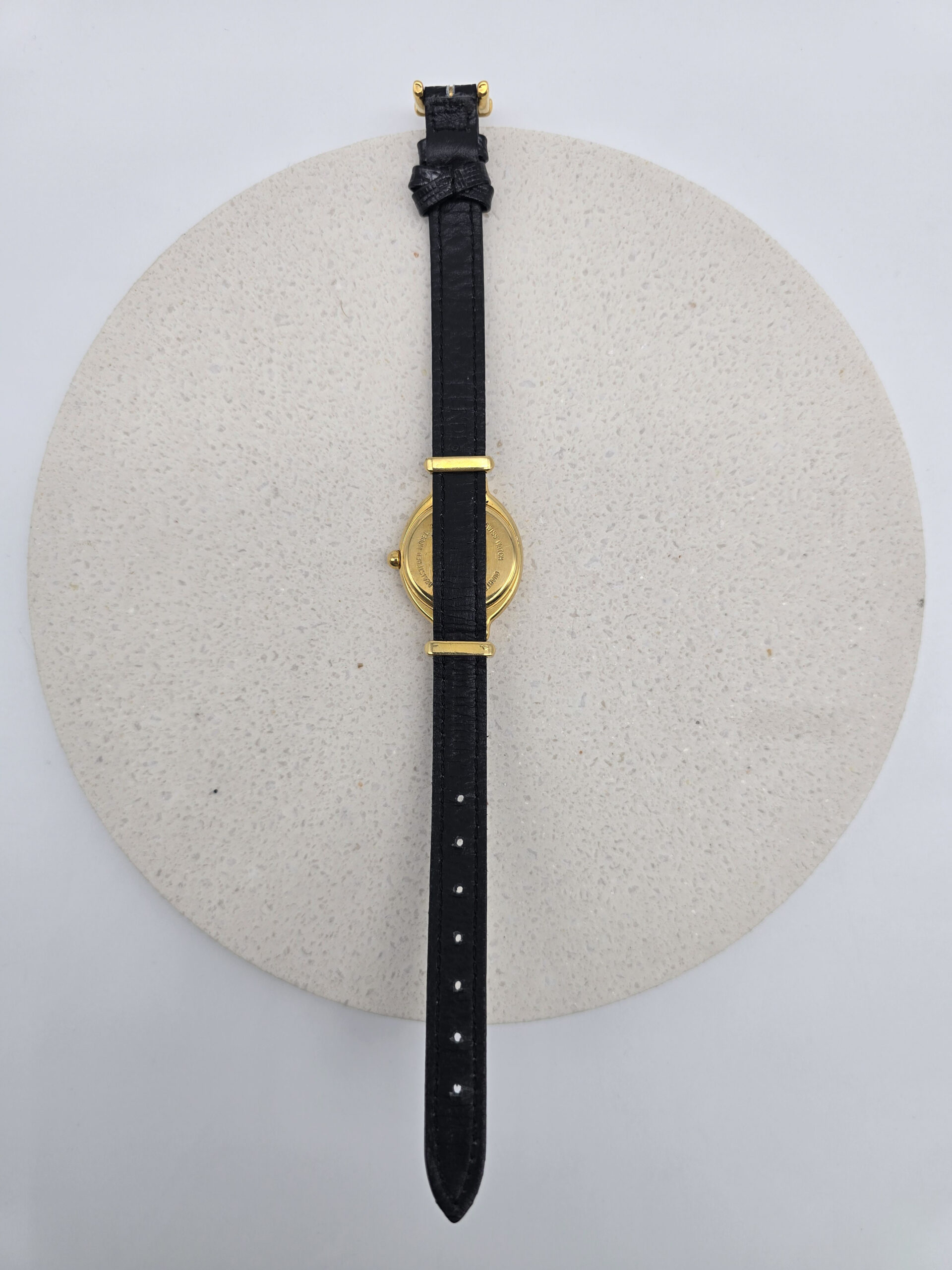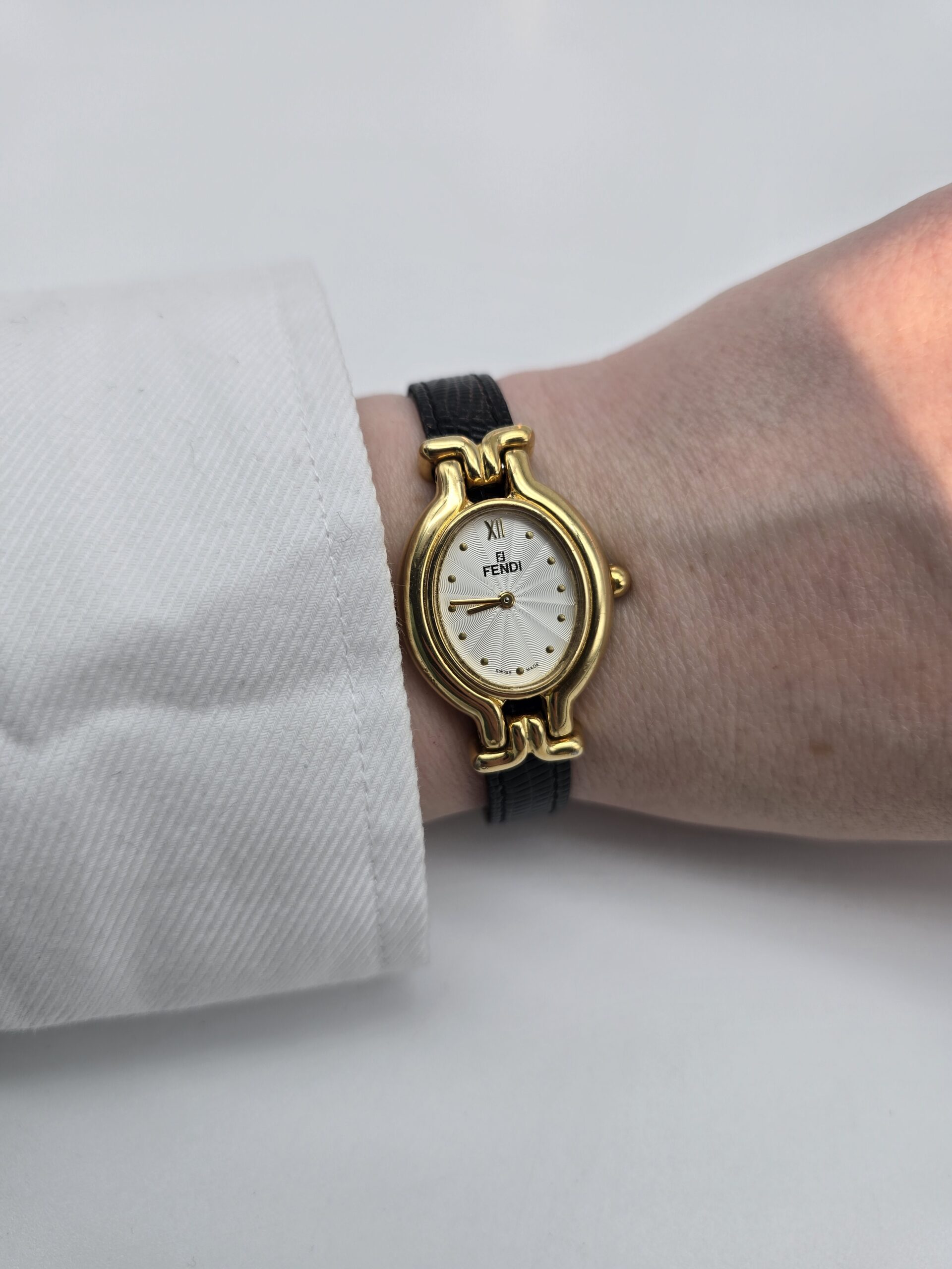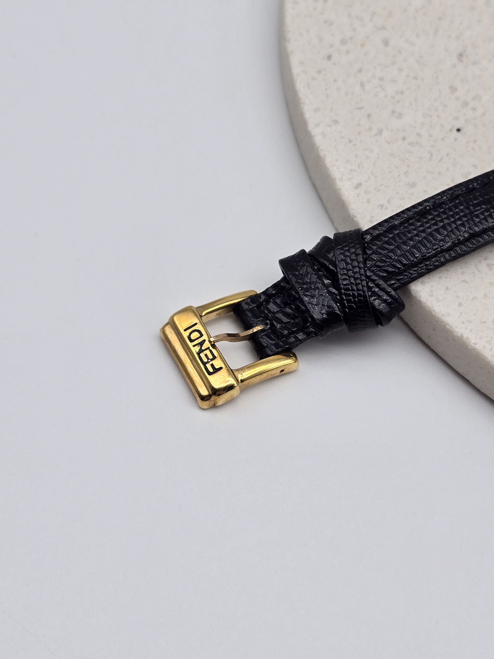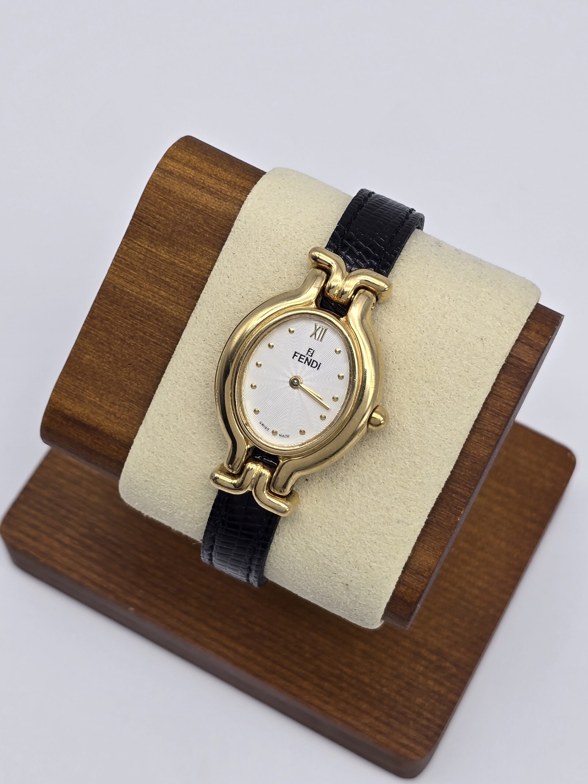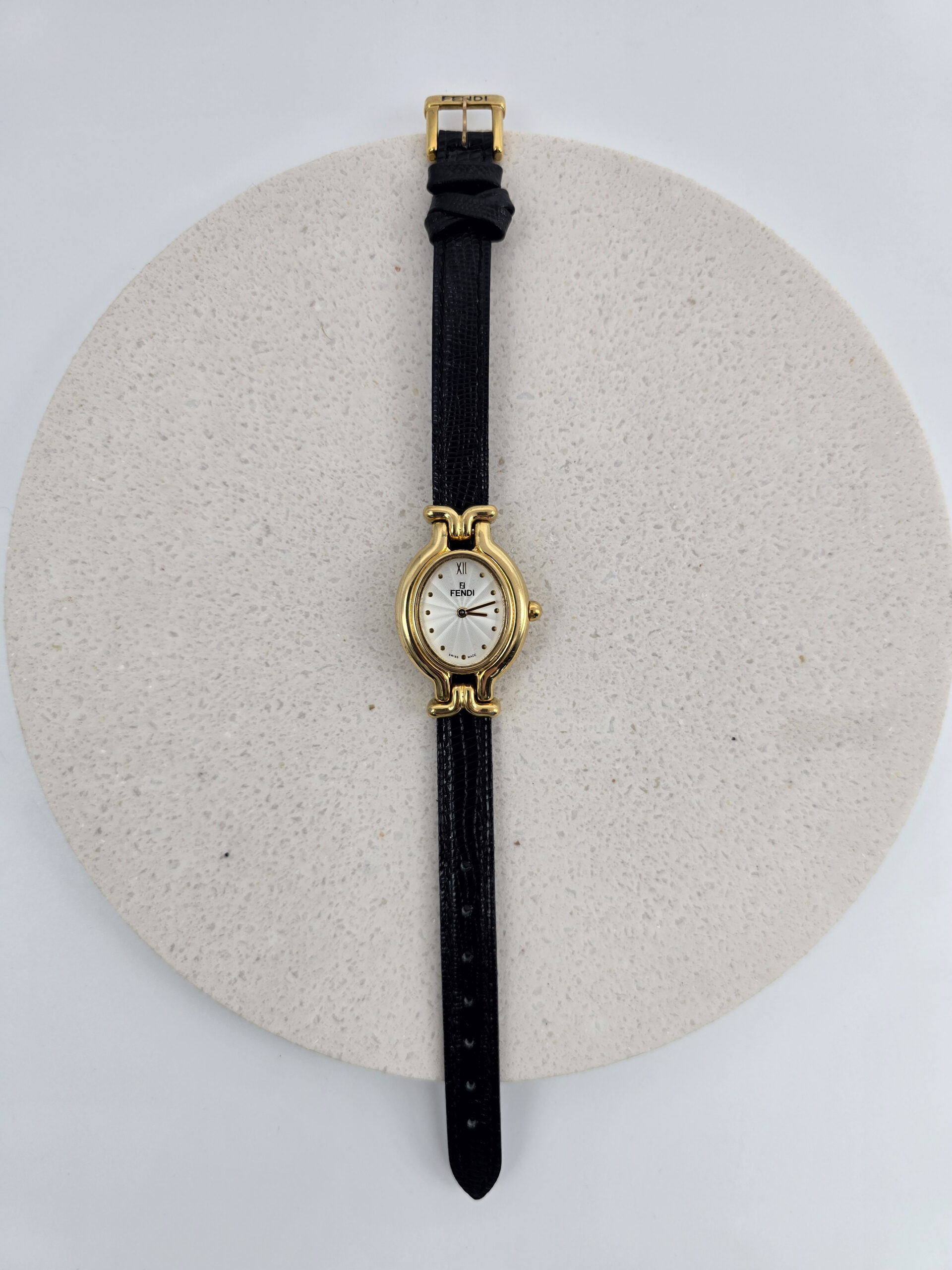 FENDI 640L – owalny złoty zegarek vintage, czarny pasek