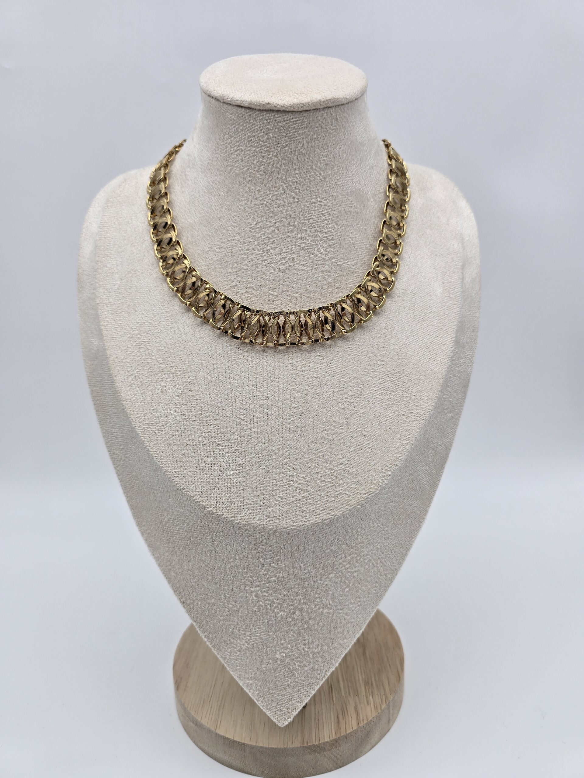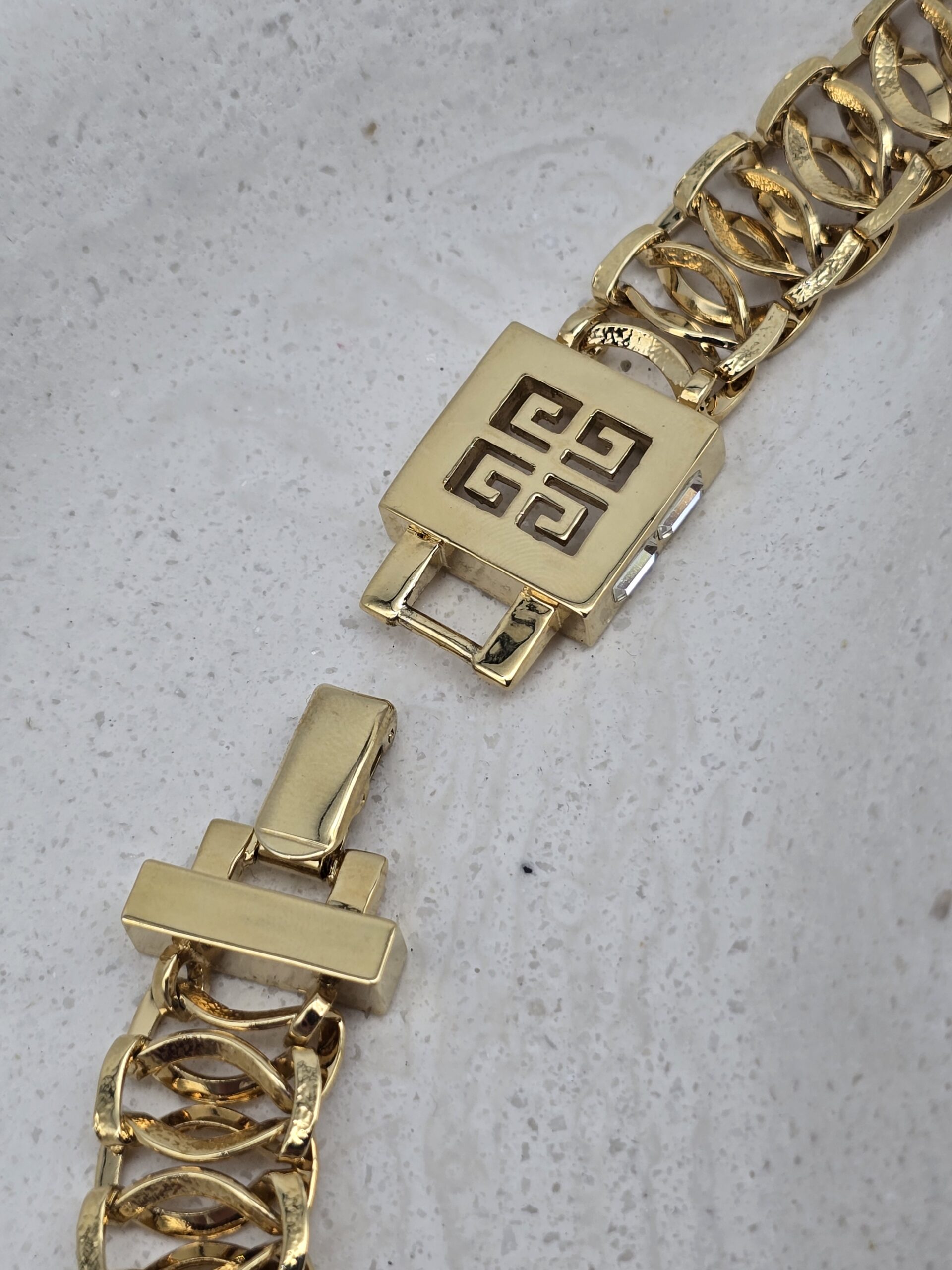 | Złoty naszyjnik Givenchy z misternie opracowanymi, fakturowanymi ogniwami to wyrazista, ale wciąż bardzo elegancka biżuteria w stylu archiwalnych kolekcji domu mody. Gęsto spleciony łańcuch pięknie układa się przy szyi, tworząc efekt „biżuteryjnego kołnierza”, który od razu podnosi rangę nawet najprostszej stylizacji.