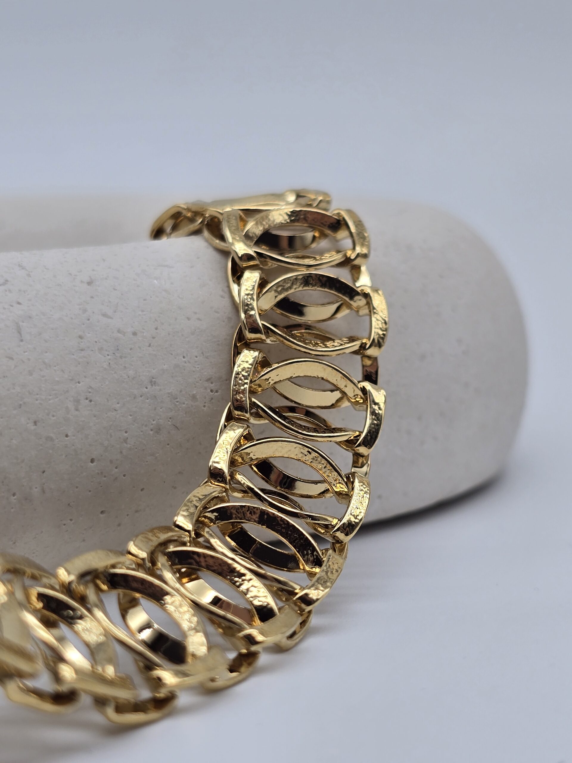 Naszyjnik ma przyjemny ciężar i wyczuwalną, „mięsistą” konstrukcję, dzięki czemu pięknie przylega do dekoltu, nie przekręcając się podczas noszenia. Połączenie gładkich i młotkowanych powierzchni sprawia, że złoto intensywnie odbija światło, ale nie wygląda krzykliwie – to raczej elegancki, rzeźbiarski akcent. Noś go solo do białej koszuli, prostego T-shirtu czy jedwabnej sukienki, albo łącz z delikatniejszymi łańcuszkami dla bardziej współczesnego efektu. Biżuteria dla kobiet, które lubią, gdy klasyczny złoty łańcuch ma wyraźny, projektancki charakter. |