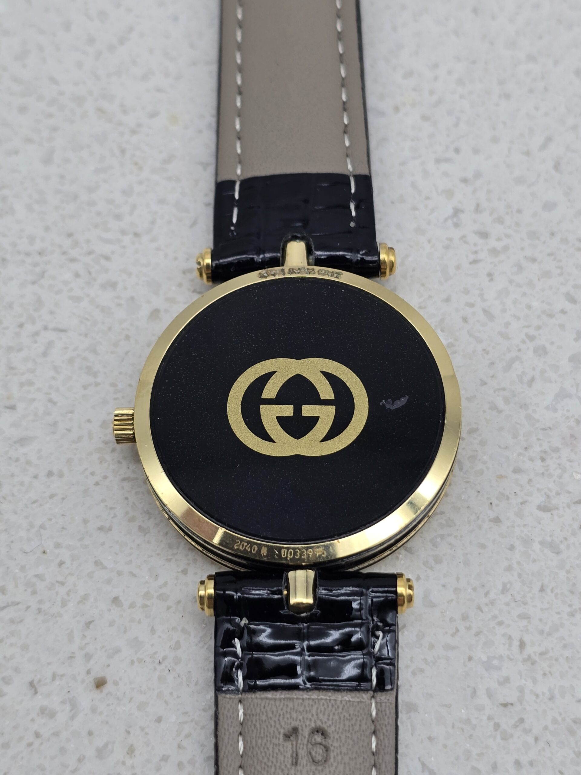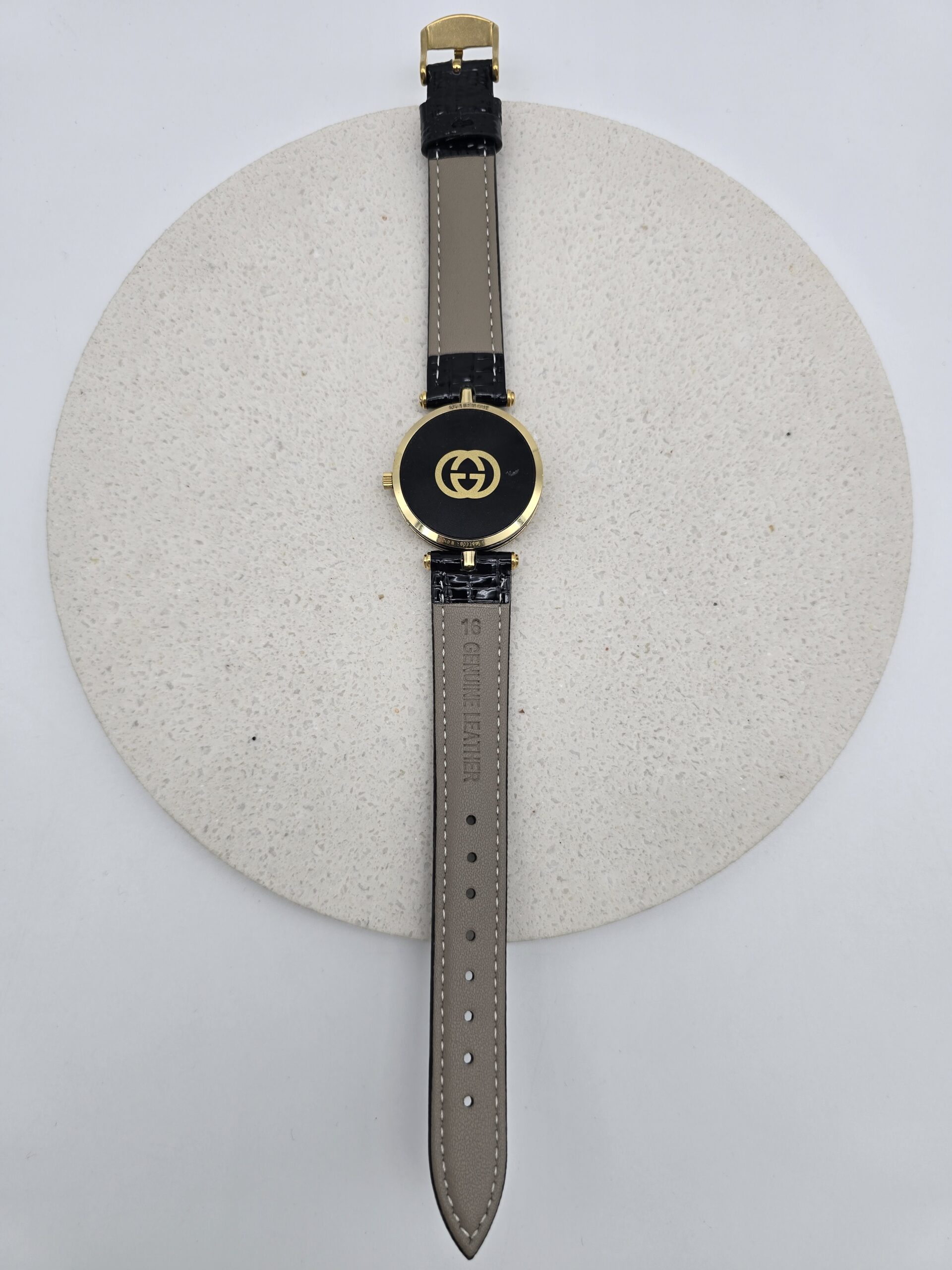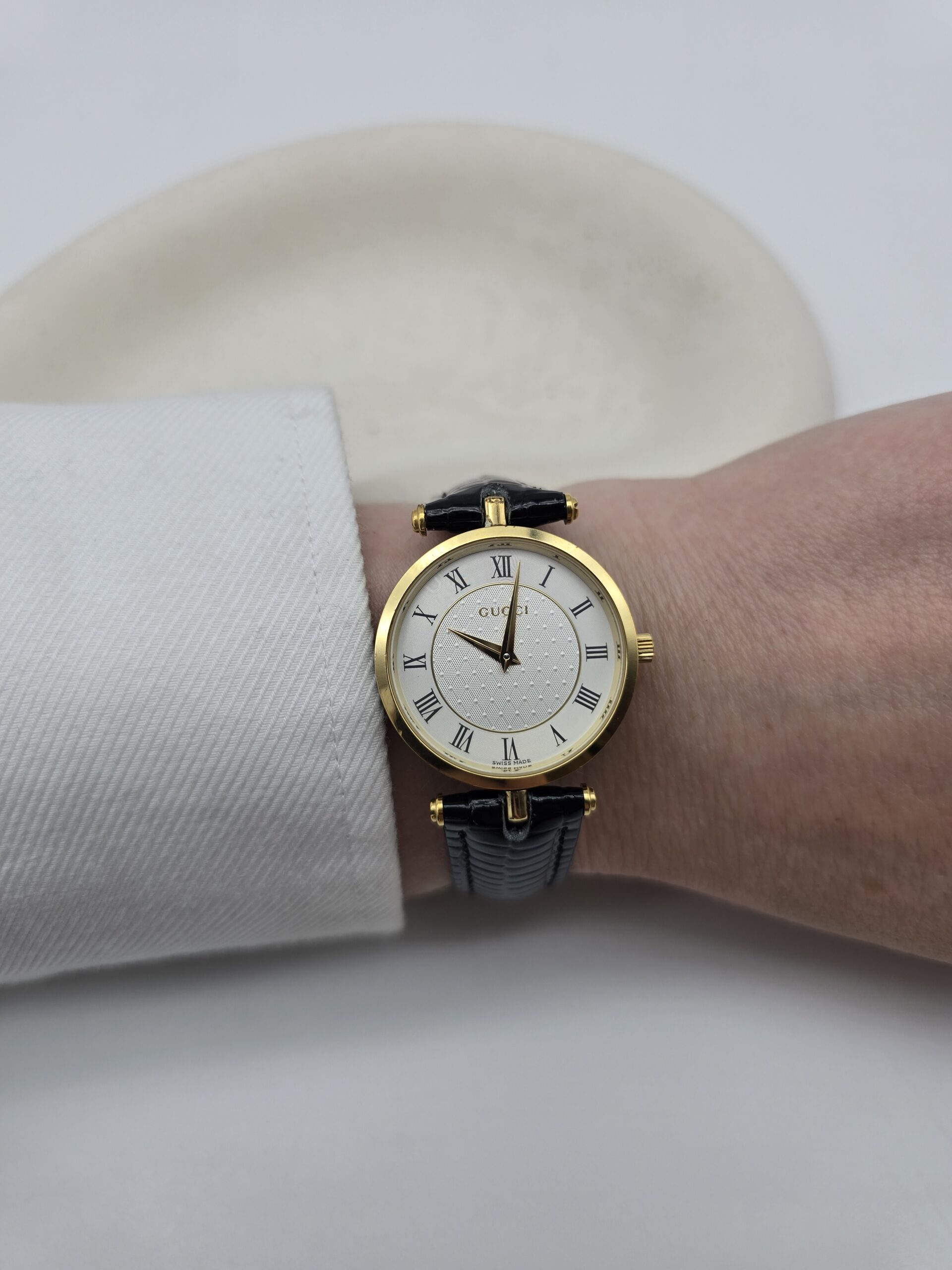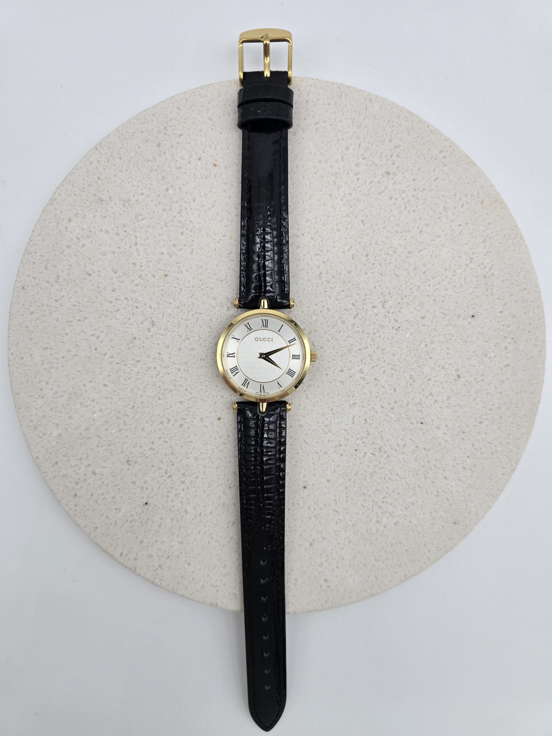 GUCCI – zegarek vintage na czarnym pasku, rzymskie indeksy