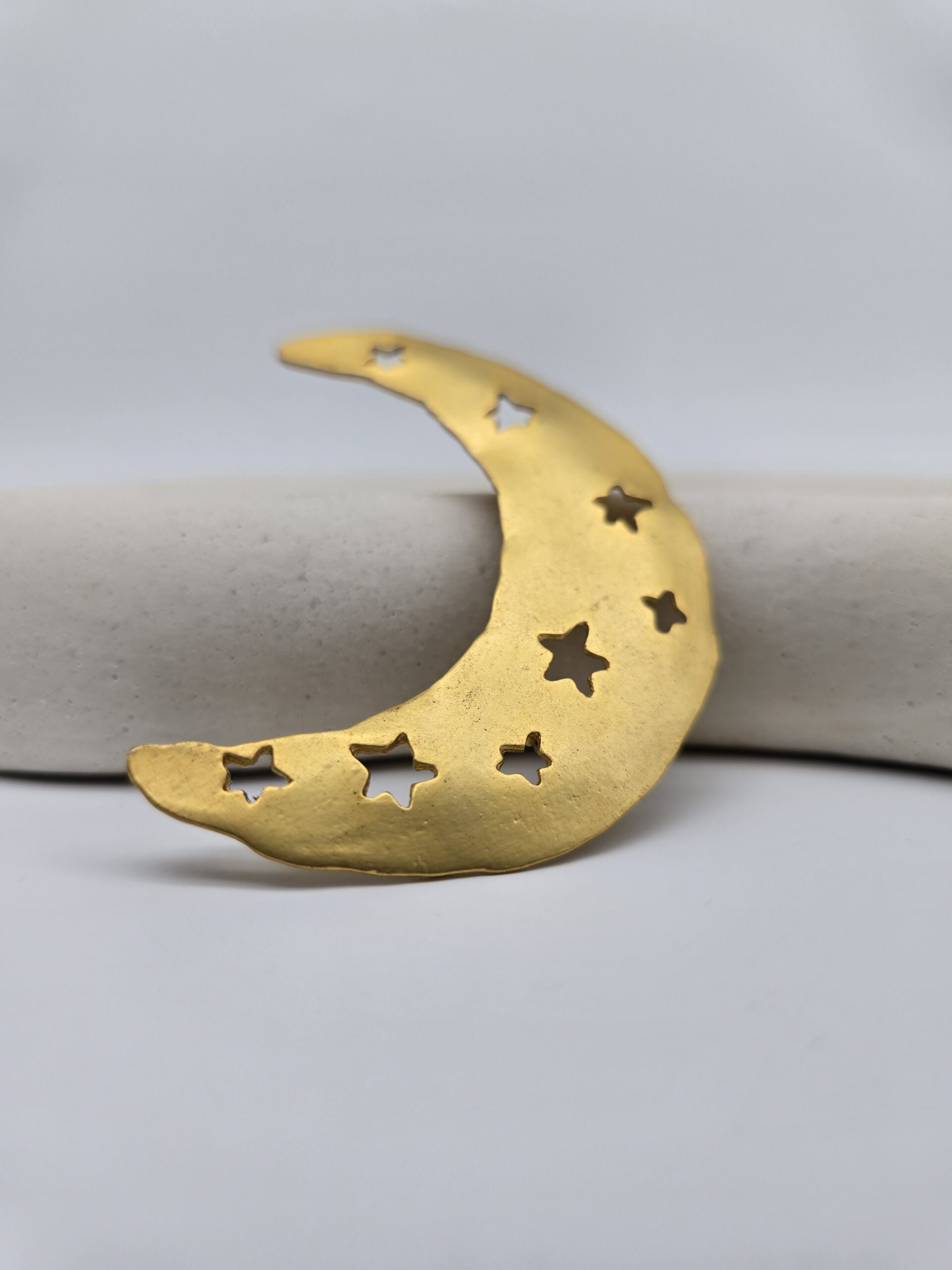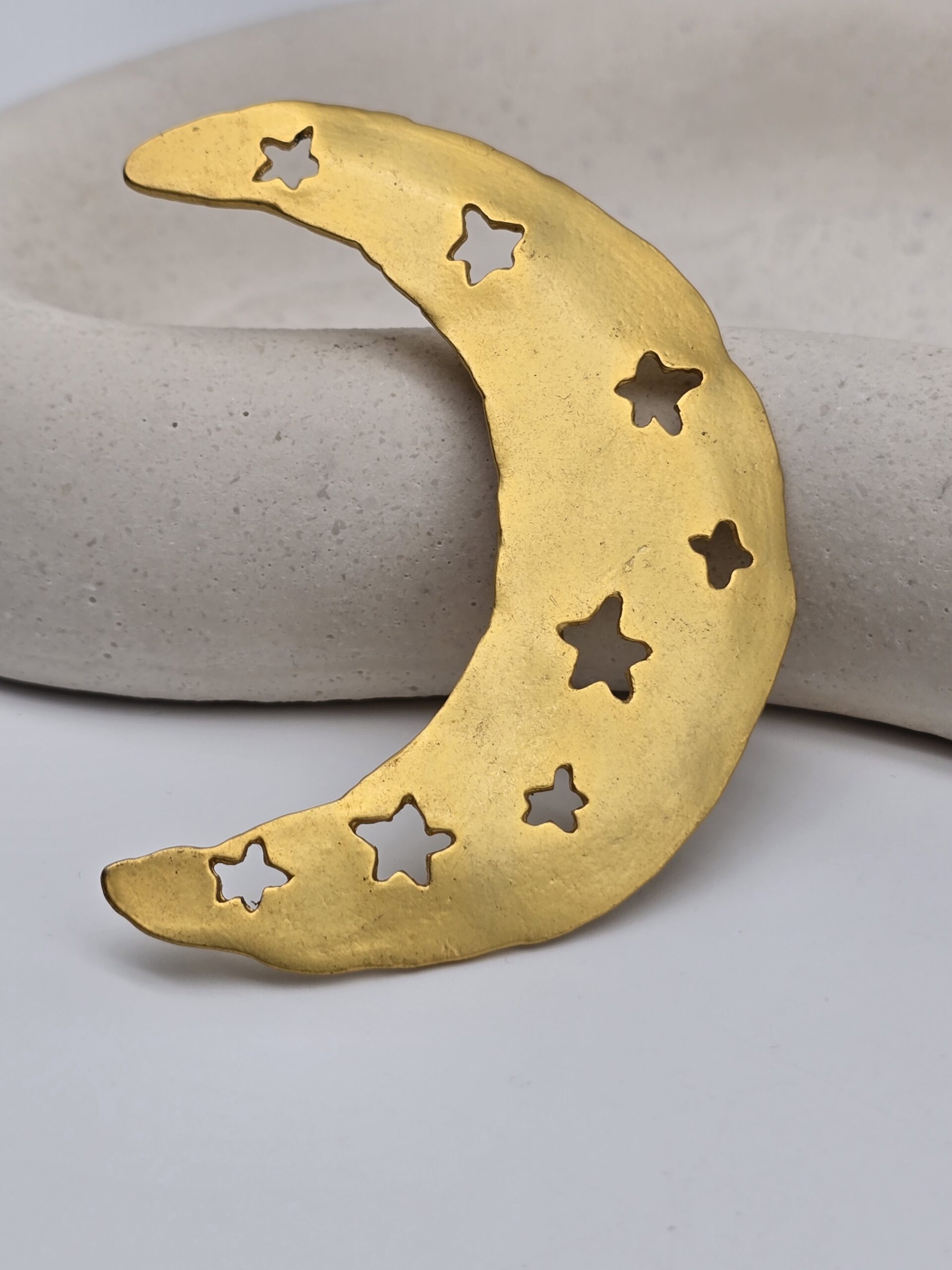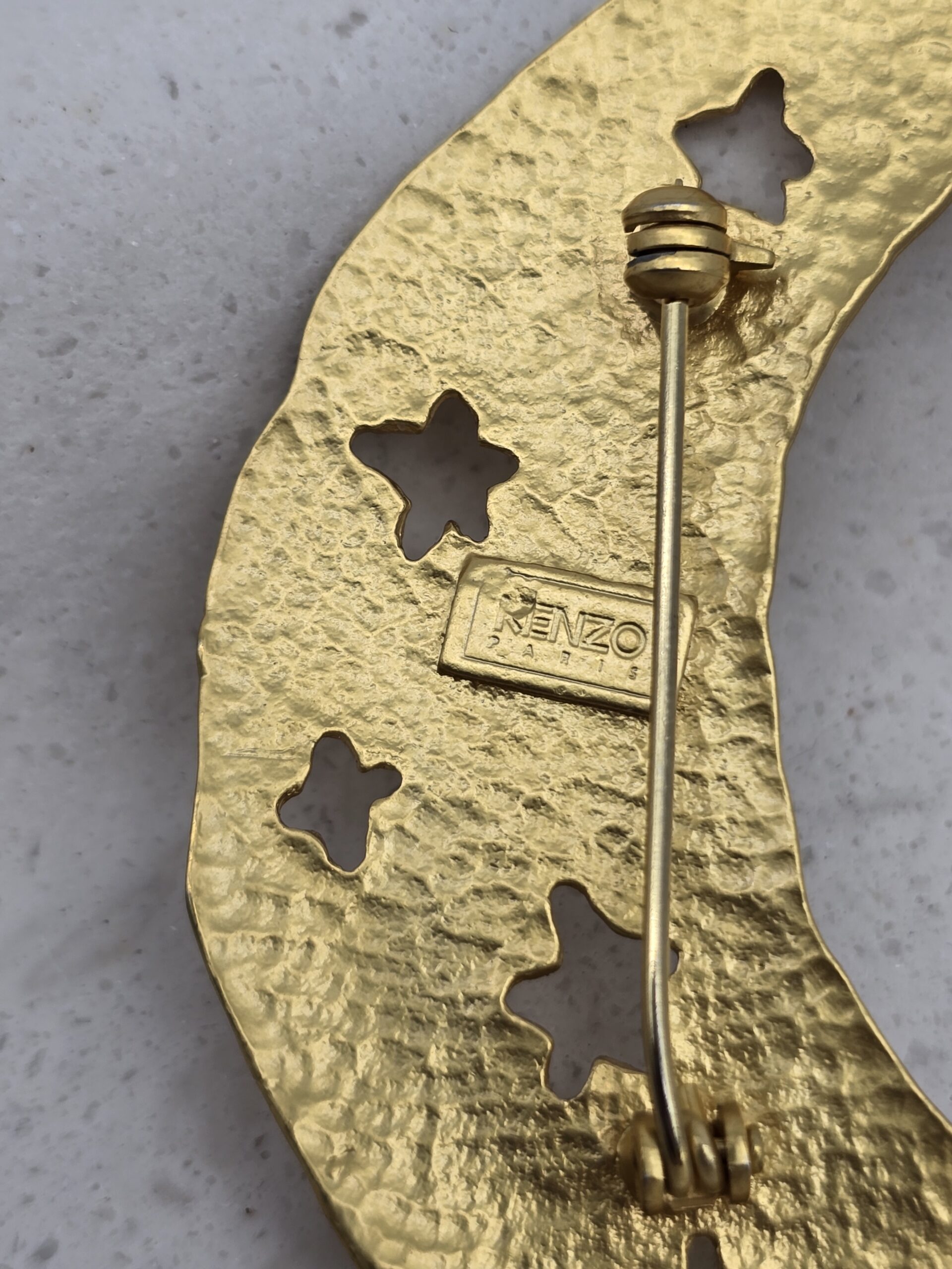 Broszka vintage Kenzo w kształcie księżyca zachwyca artystyczną formą i subtelnym blaskiem. Ręcznie młotkowana powierzchnia i wycięcia w kształcie gwiazd tworzą niepowtarzalną kompozycję, przywołującą na myśl nocne niebo nad Paryżem. To propozycja dla kobiet, które cenią odważne dodatki z duszą i szukają w biżuterii poezji.