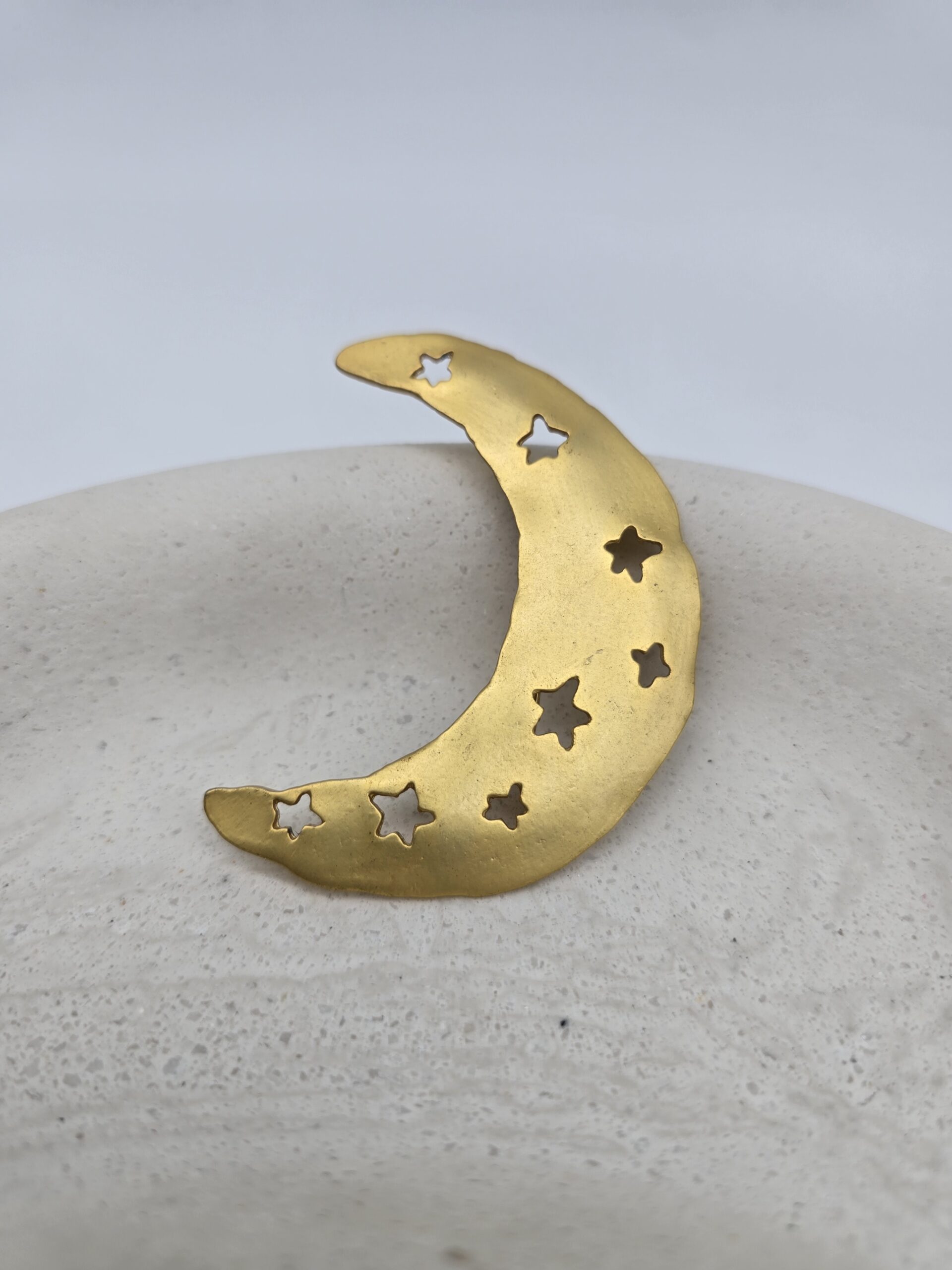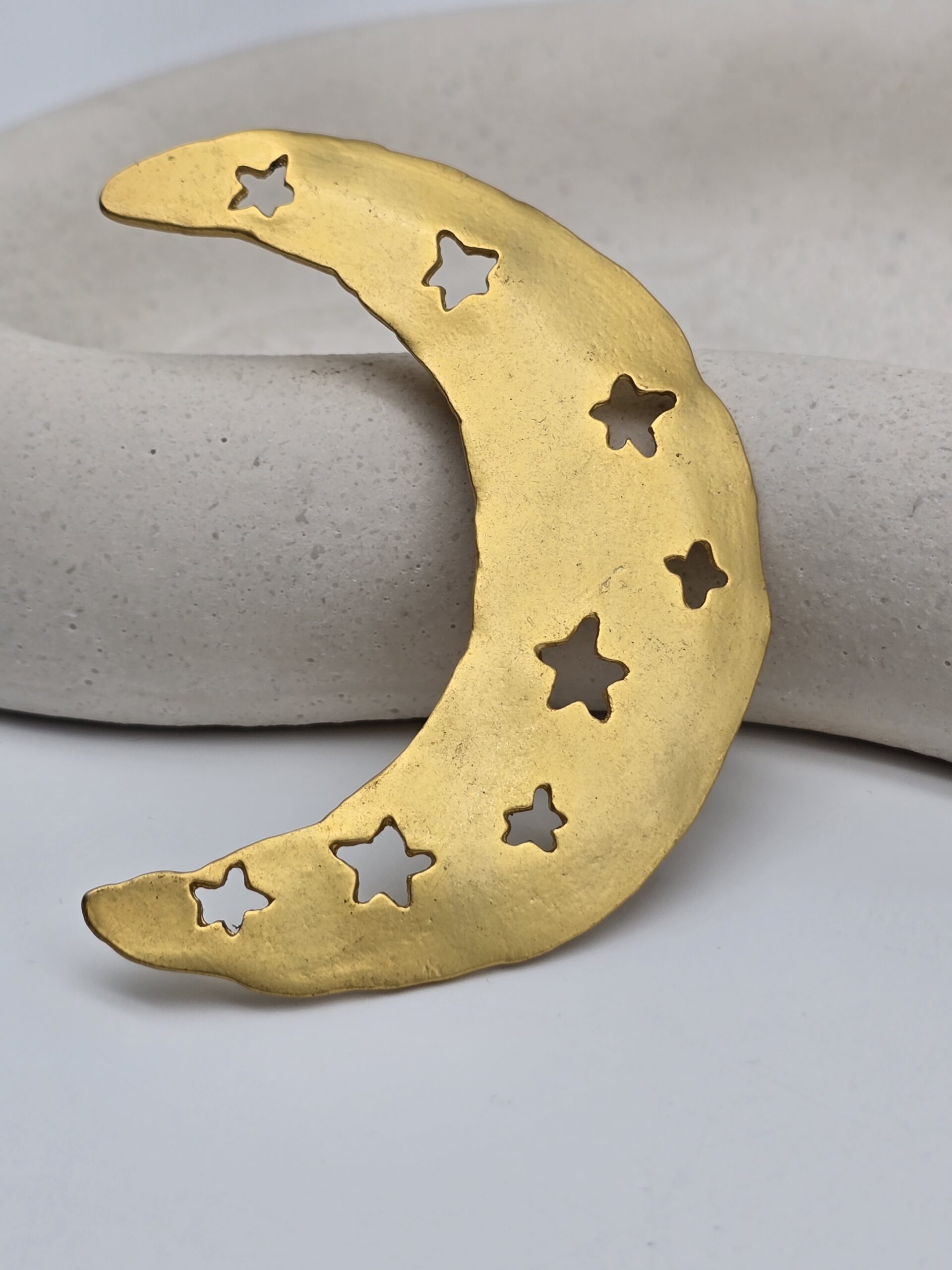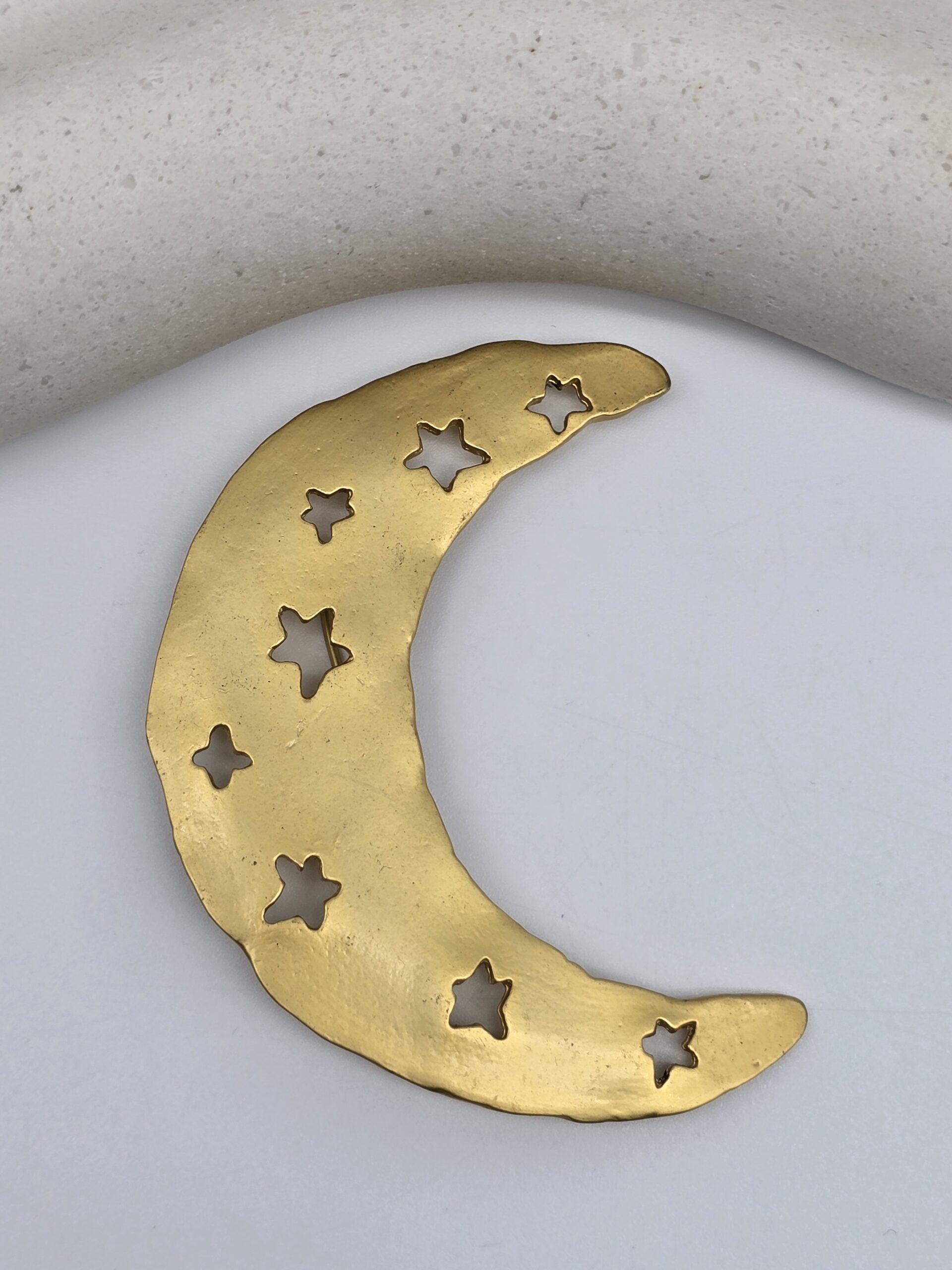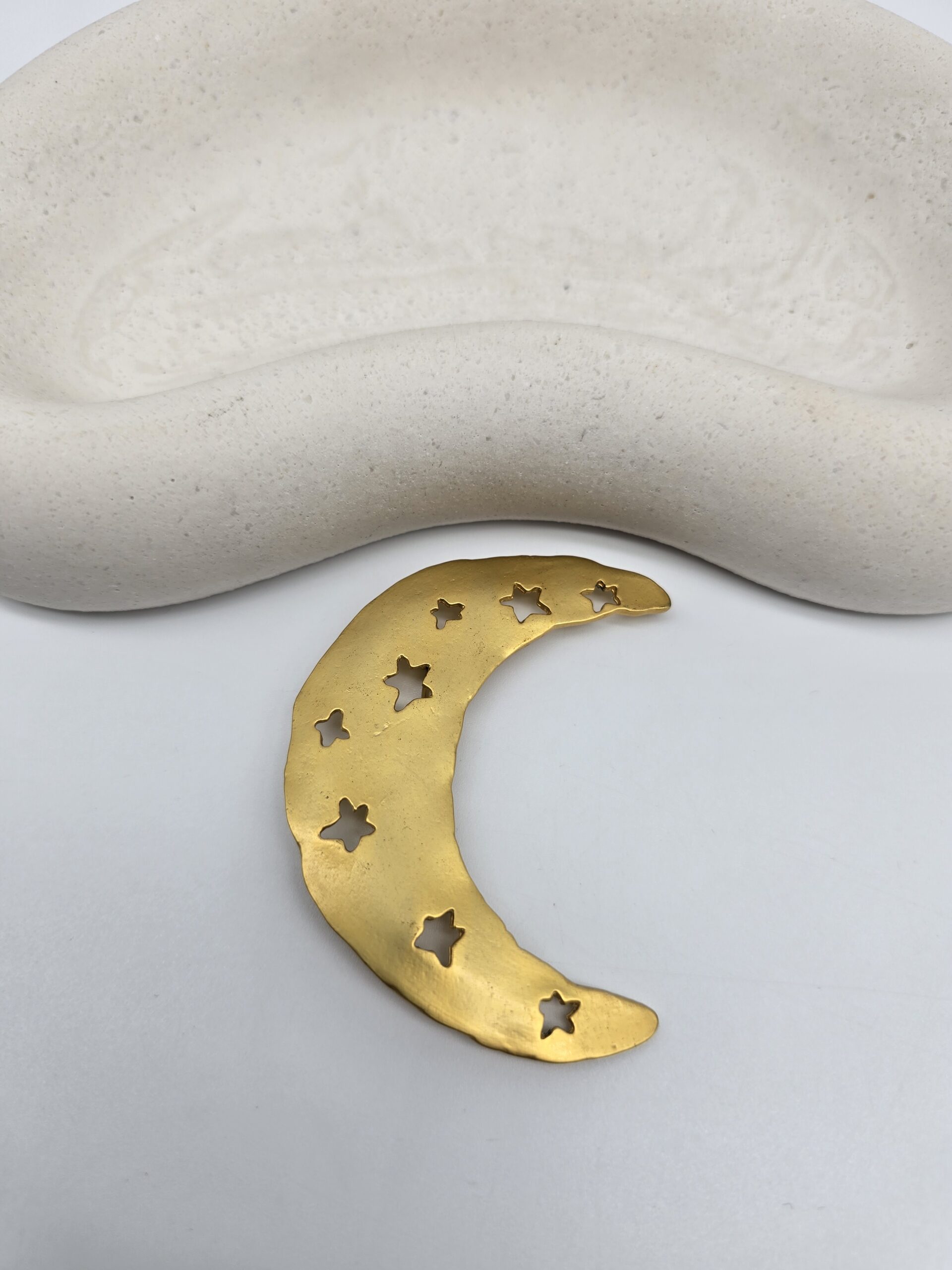 Broszka vintage Kenzo w kształcie księżyca zachwyca artystyczną formą i subtelnym blaskiem. Ręcznie młotkowana powierzchnia i wycięcia w kształcie gwiazd tworzą niepowtarzalną kompozycję, przywołującą na myśl nocne niebo nad Paryżem. To propozycja dla kobiet, które cenią odważne dodatki z duszą i szukają w biżuterii poezji.