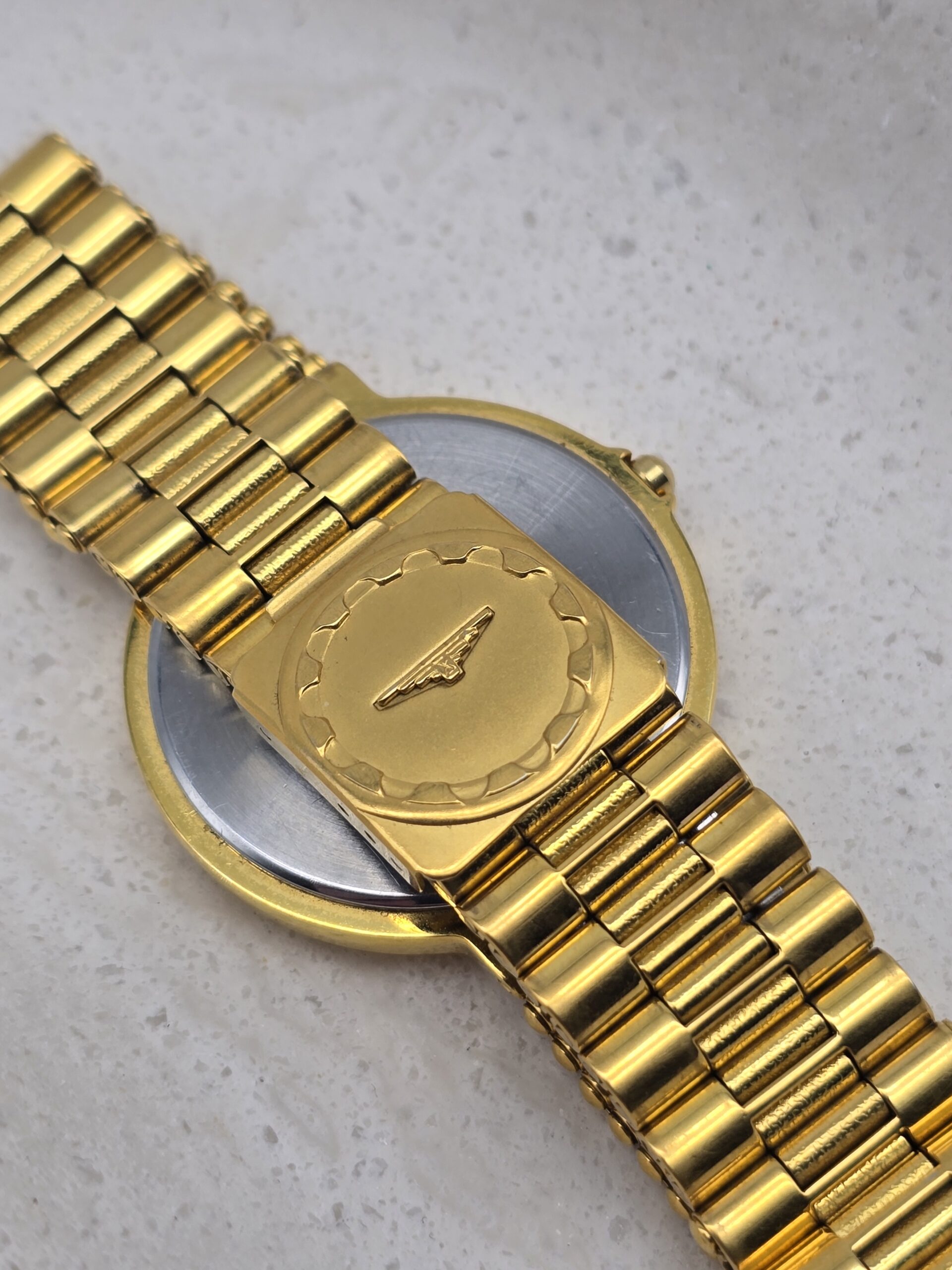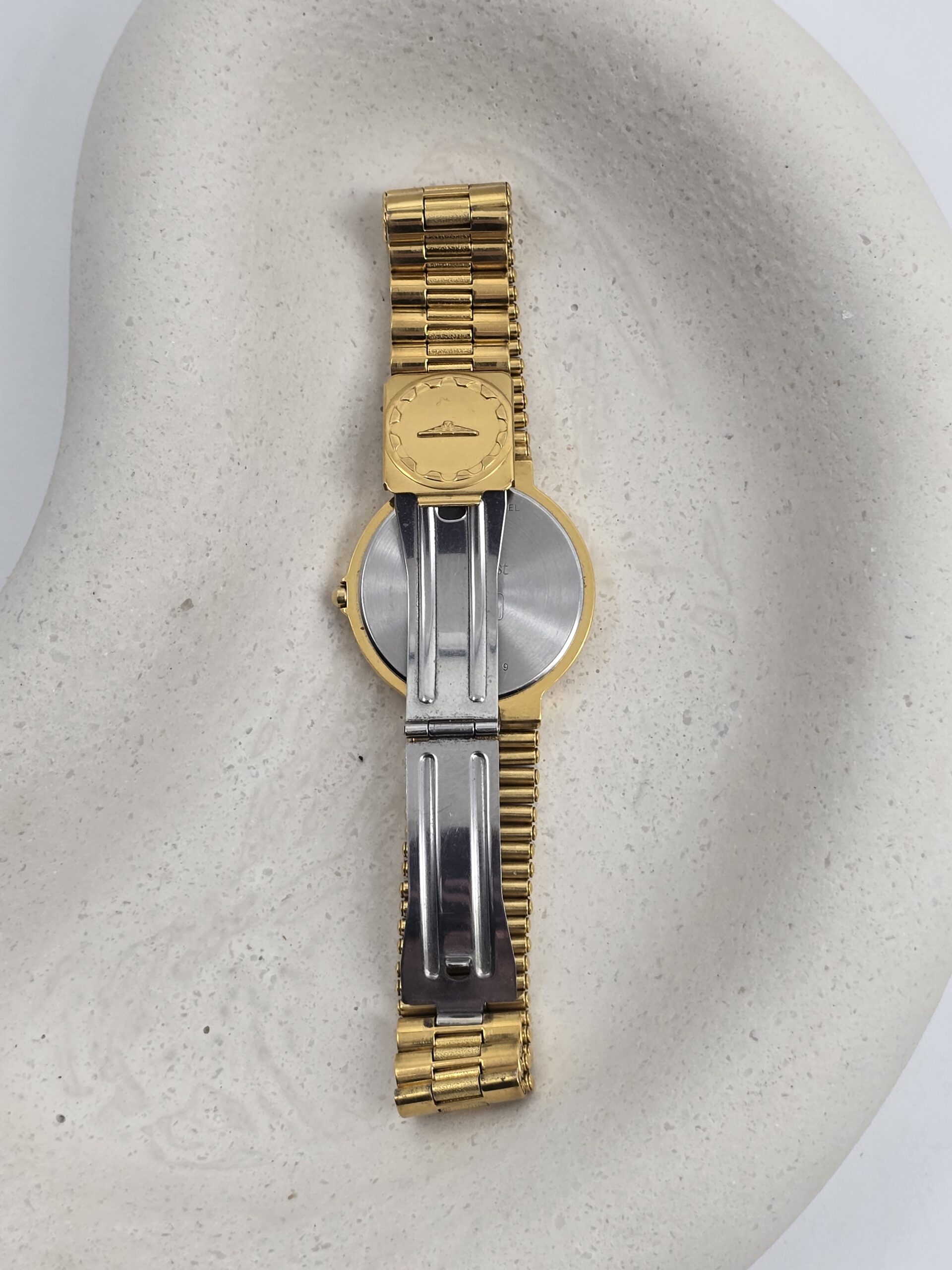 Longines Conquest z lat 90. to klasyka w bardziej wyrazistym, biżuteryjnym wydaniu. Złota koperta i bransoleta pięknie odbijają światło, a fakturowana tarcza w ciepłym odcieniu nadaje całości miękkości i charakteru. To zegarek, który wygląda jak detal z garderoby – dopracowany, ale nienachalny.