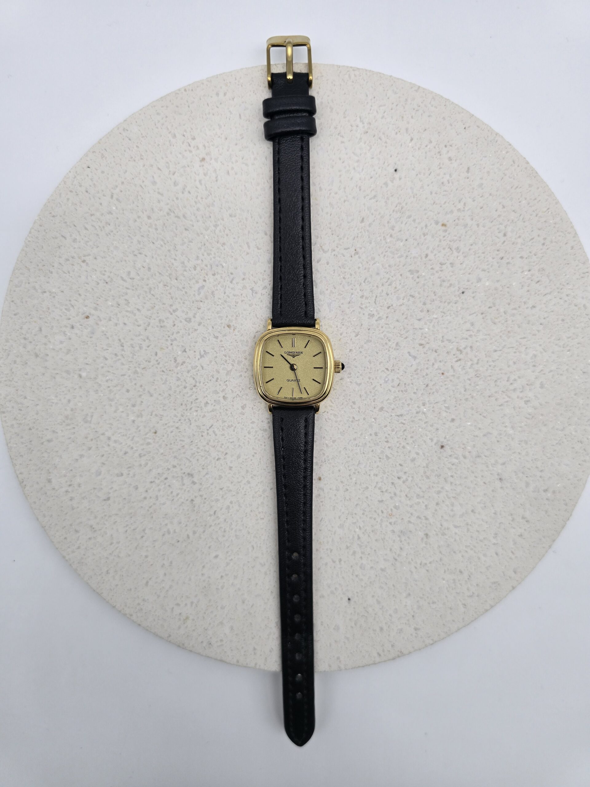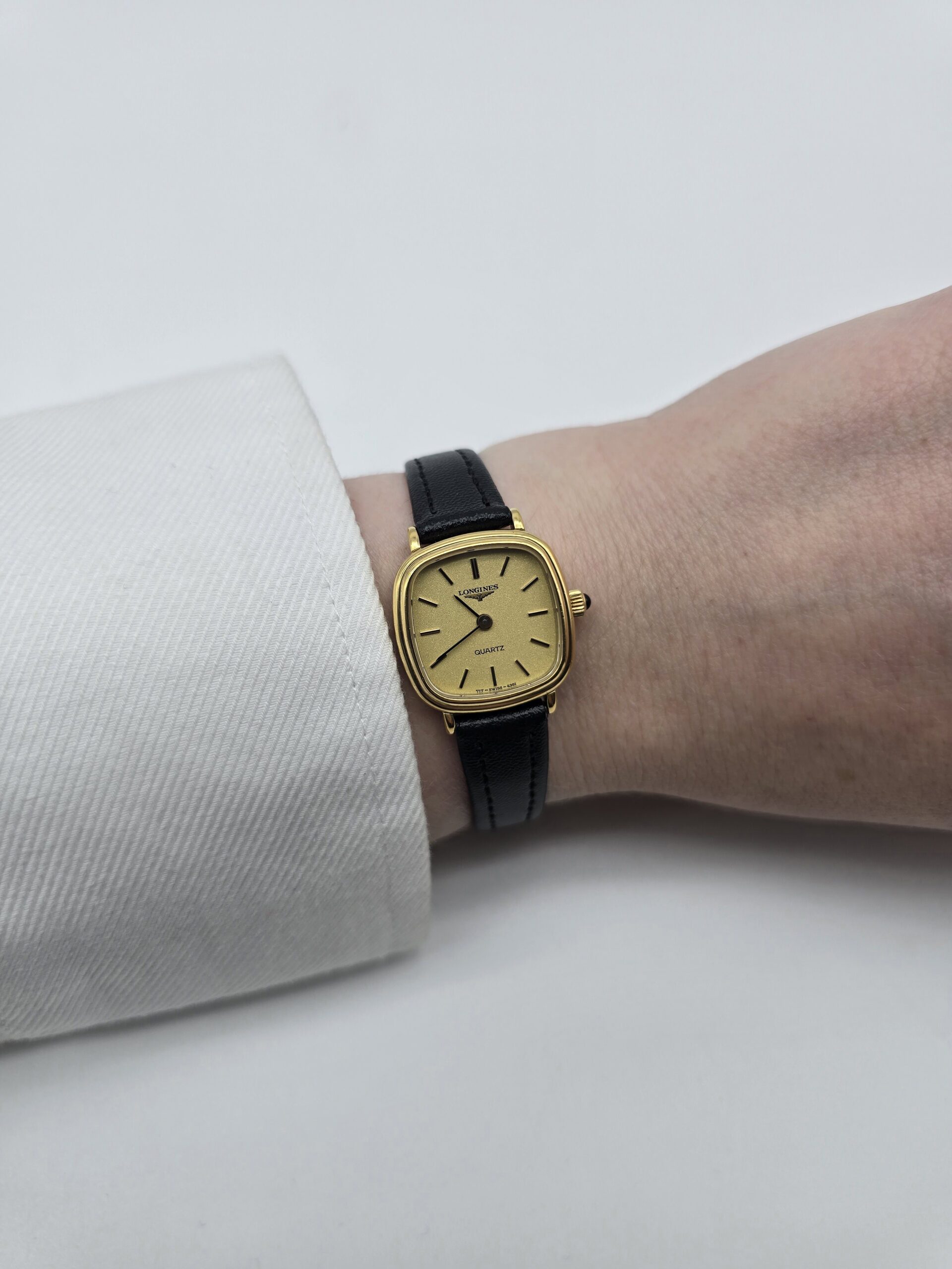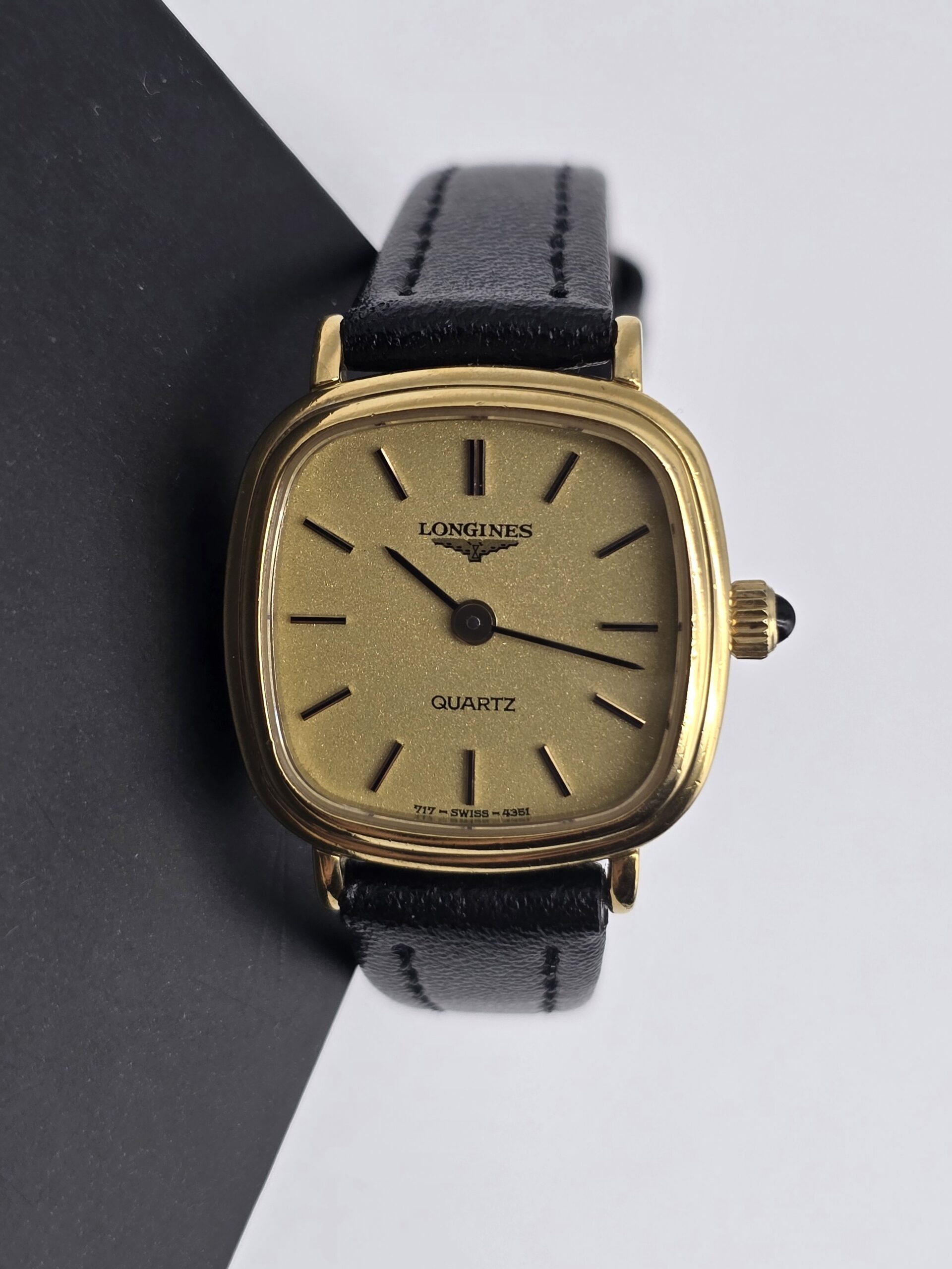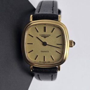 LONGINES – zegarek vintage, zlota tarcza, kwadratowa koperta, lata 80., certyfikat