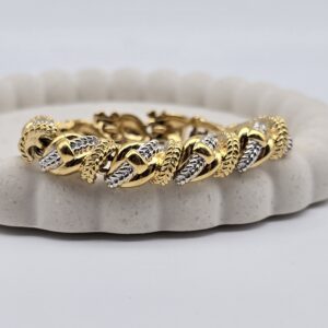 Wyjątkowa bransoletka vintage marki Nina Ricci to połączenie francuskiej klasyki i artystycznego wyrafinowania. Stworzona dla kobiet, które cenią ponadczasowe dodatki i subtelny luksus, zachwyca oryginalnym splotem oraz eleganckim kontrastem złota i srebra. To biżuteria, która podkreśla indywidualny styl i wyczucie smaku.