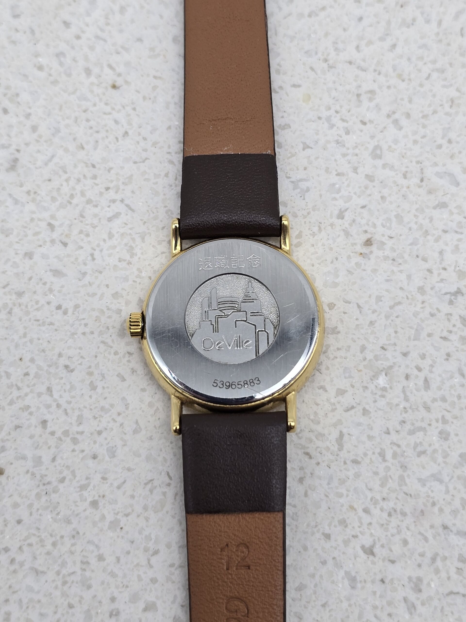 OMEGA DE VILLE – zegarek vintage ze złotą kopertą, lata 70., brązowy pasek