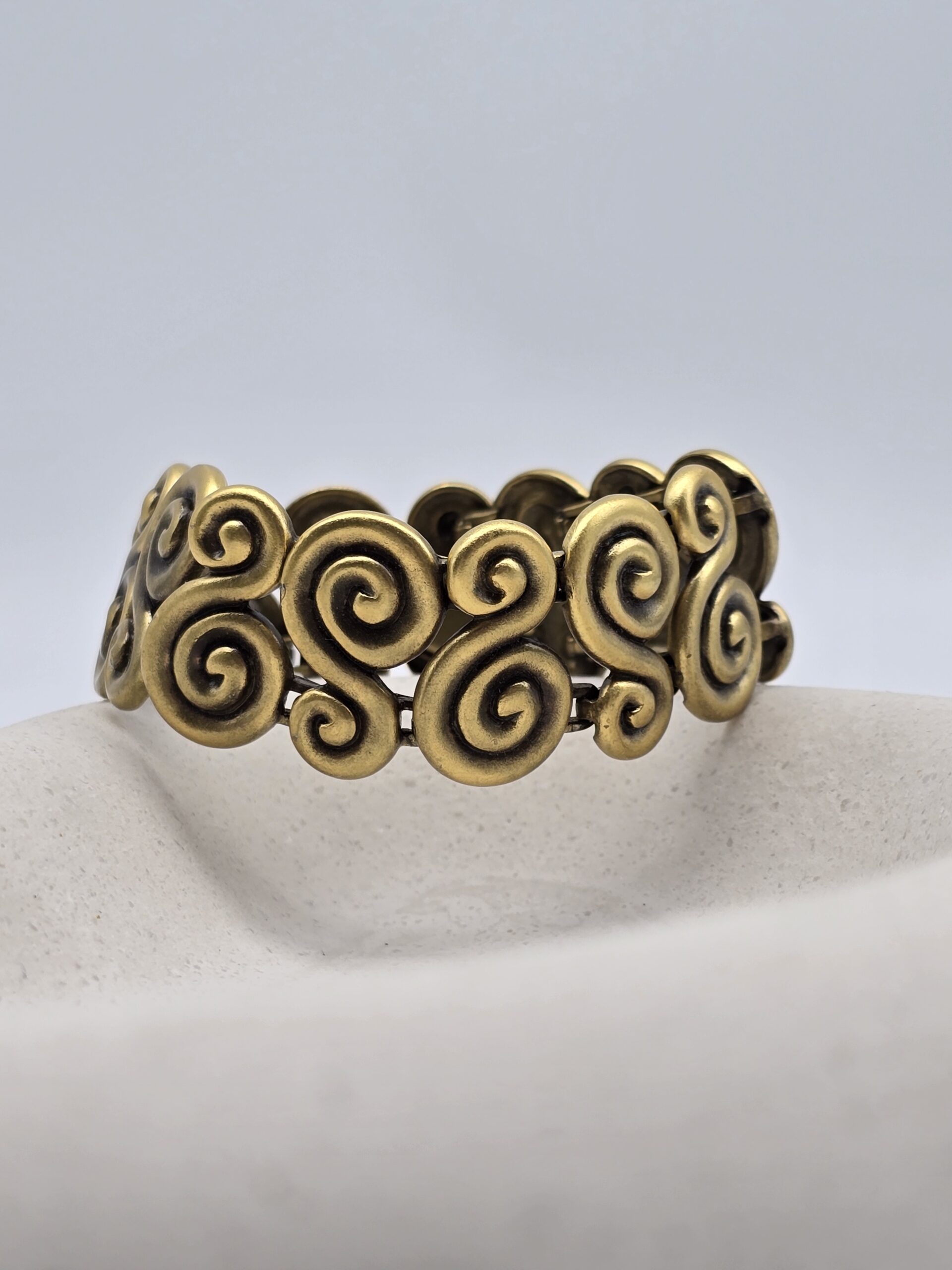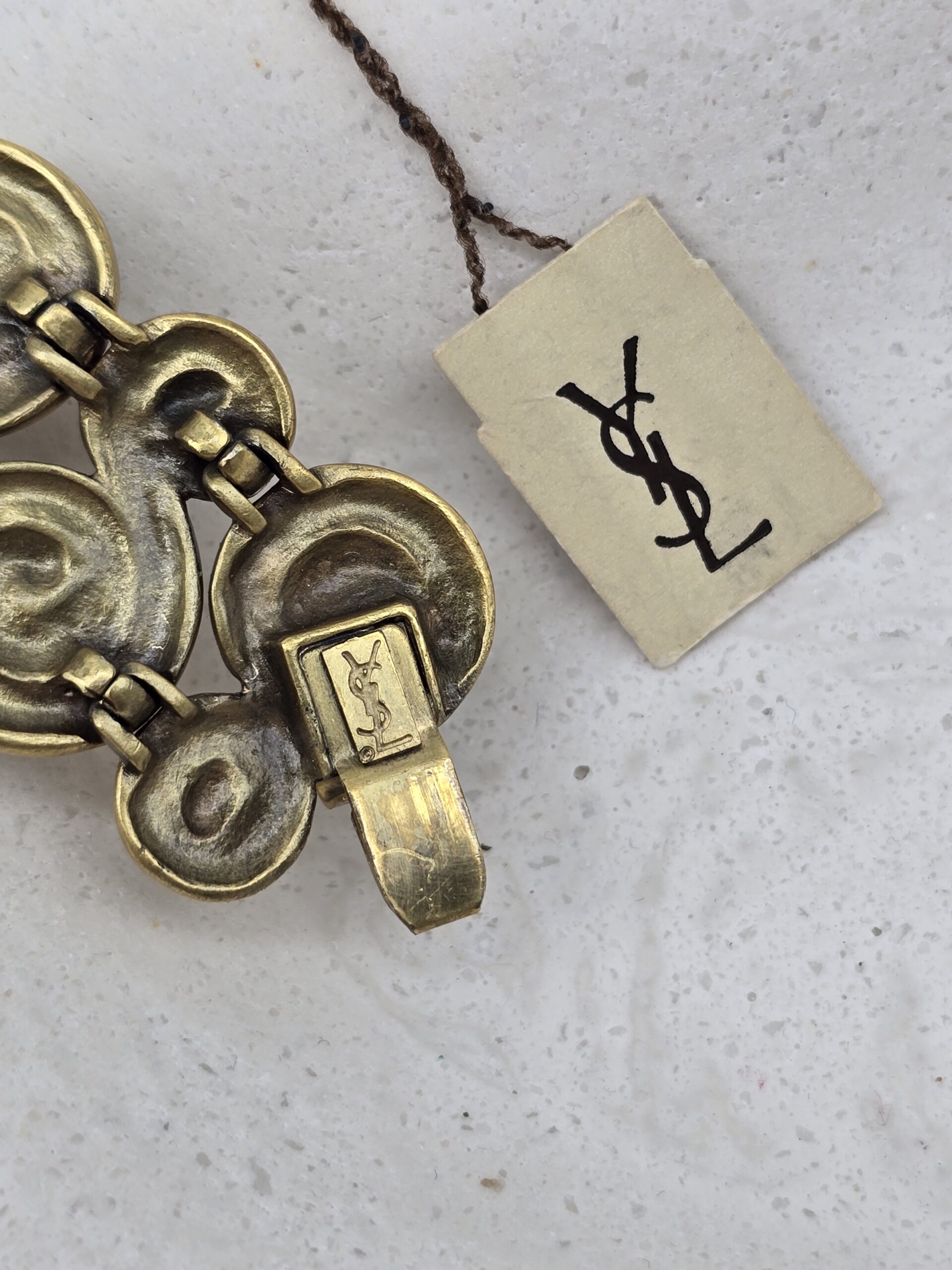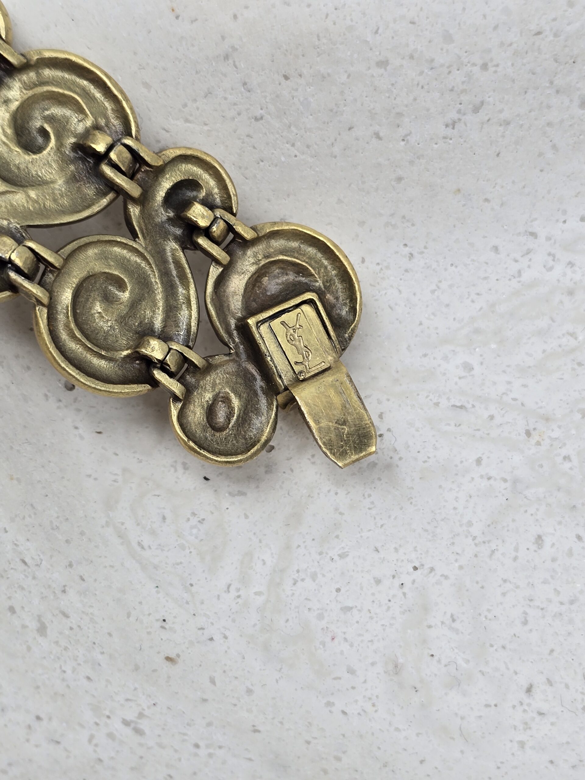 Bransoletka vintage Yves Saint Laurent to wyrazisty, złoty dodatek z charakterystycznym motywem spiral. Rzeźbiona forma i lekko przyciemniane wykończenie podkreślają styl vintage. To model dla kobiet, które lubią mocniejsze akcenty i chcą, żeby biżuteria była głównym elementem stylizacji.