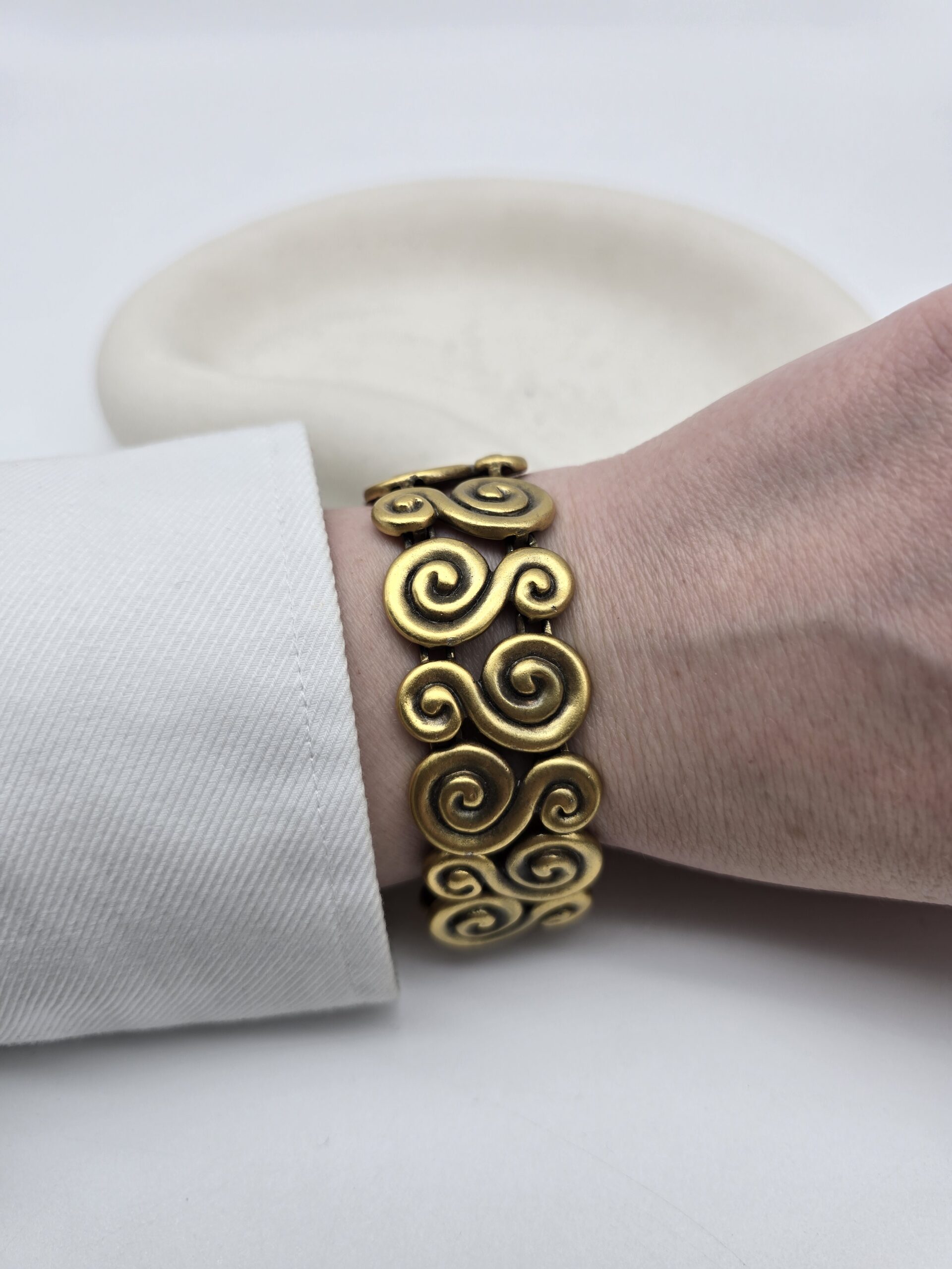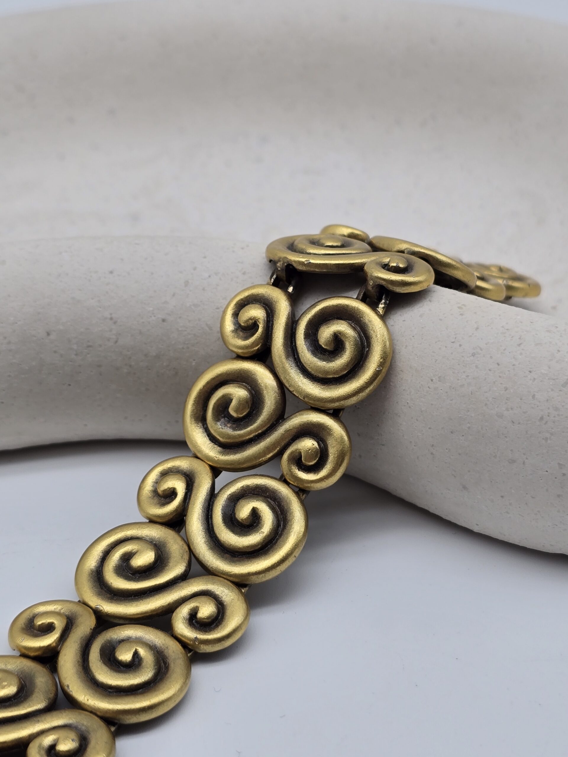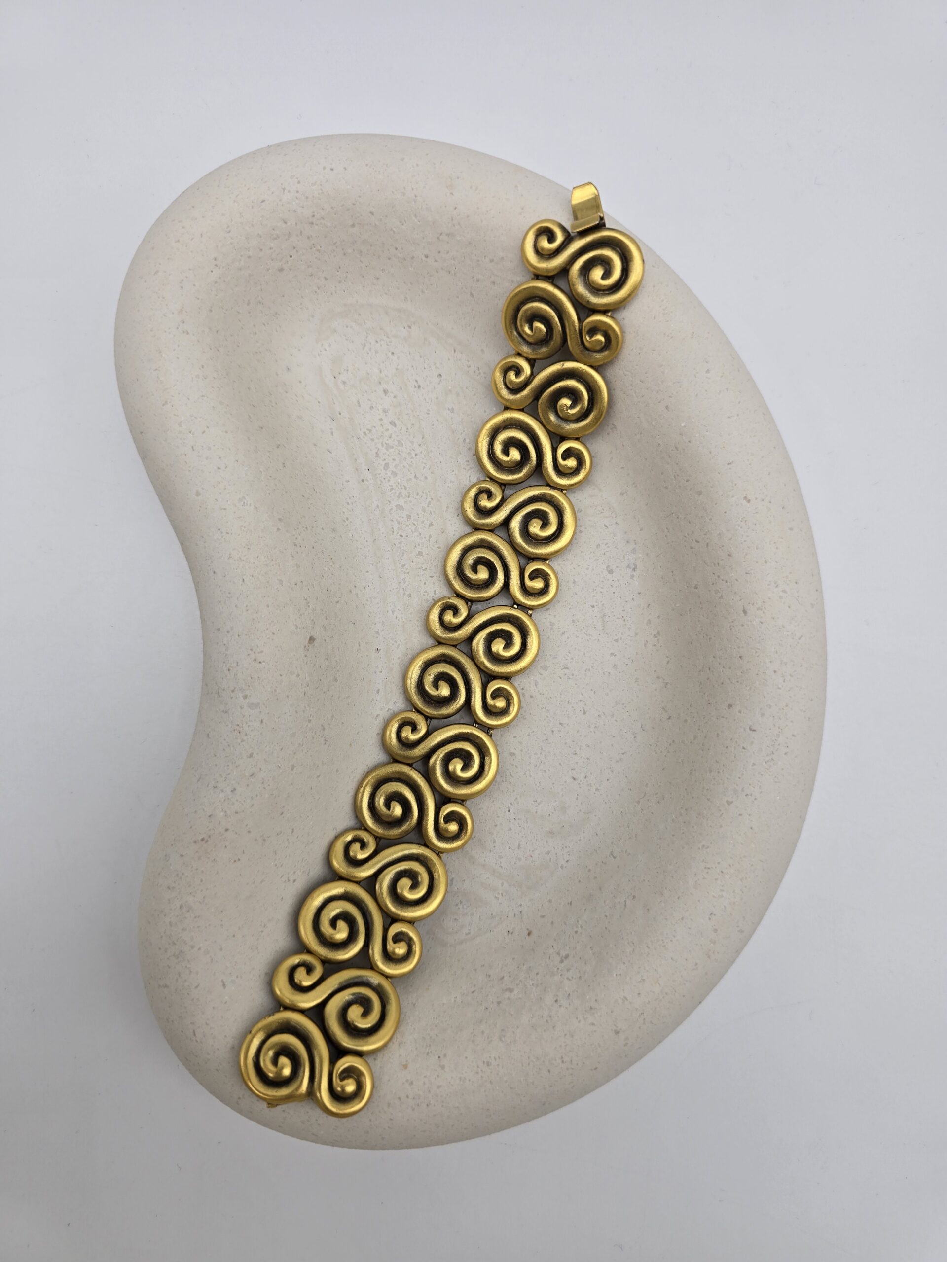 Bransoletka vintage Yves Saint Laurent to wyrazisty, złoty dodatek z charakterystycznym motywem spiral. Rzeźbiona forma i lekko przyciemniane wykończenie podkreślają styl vintage. To model dla kobiet, które lubią mocniejsze akcenty i chcą, żeby biżuteria była głównym elementem stylizacji.