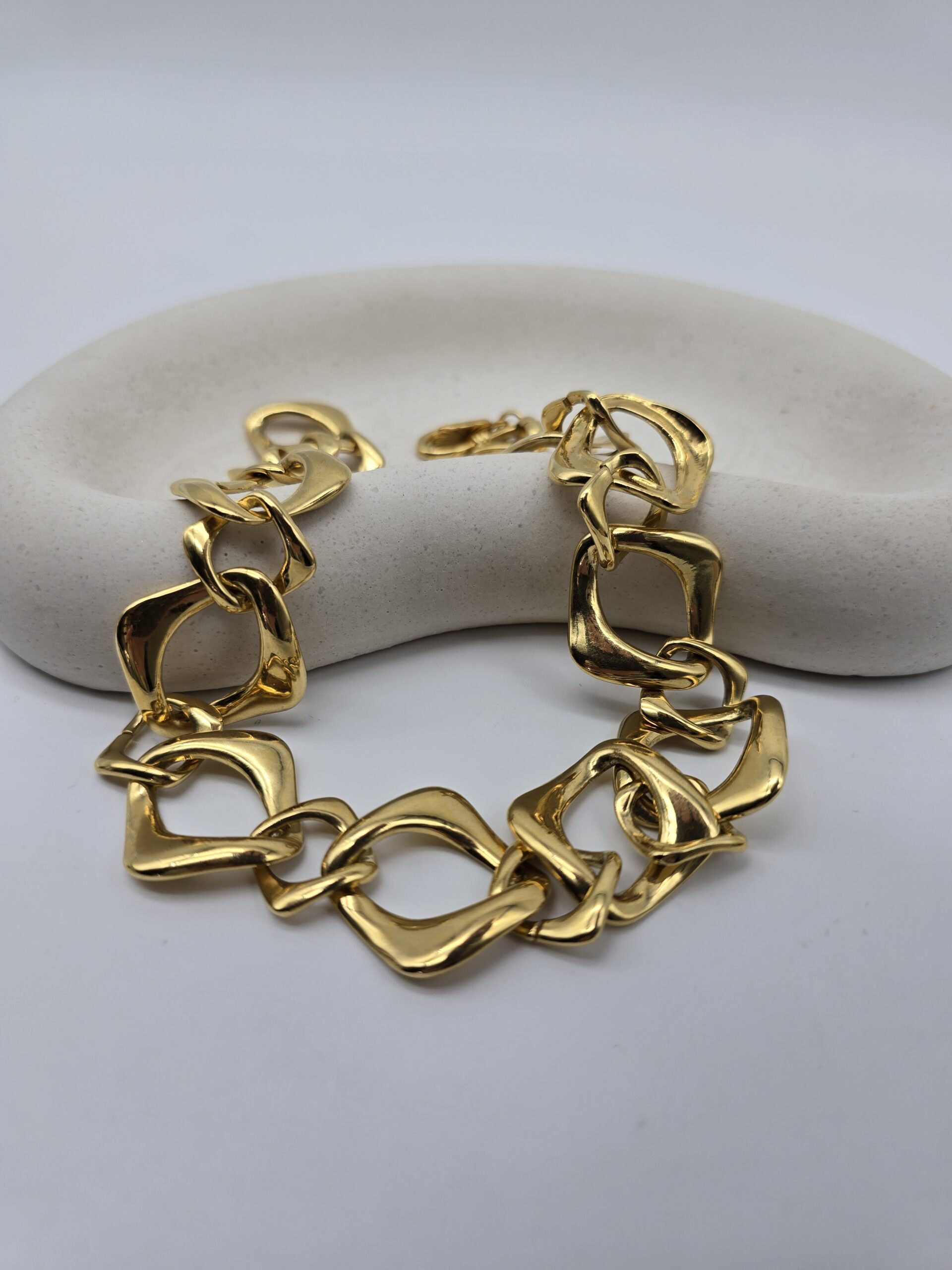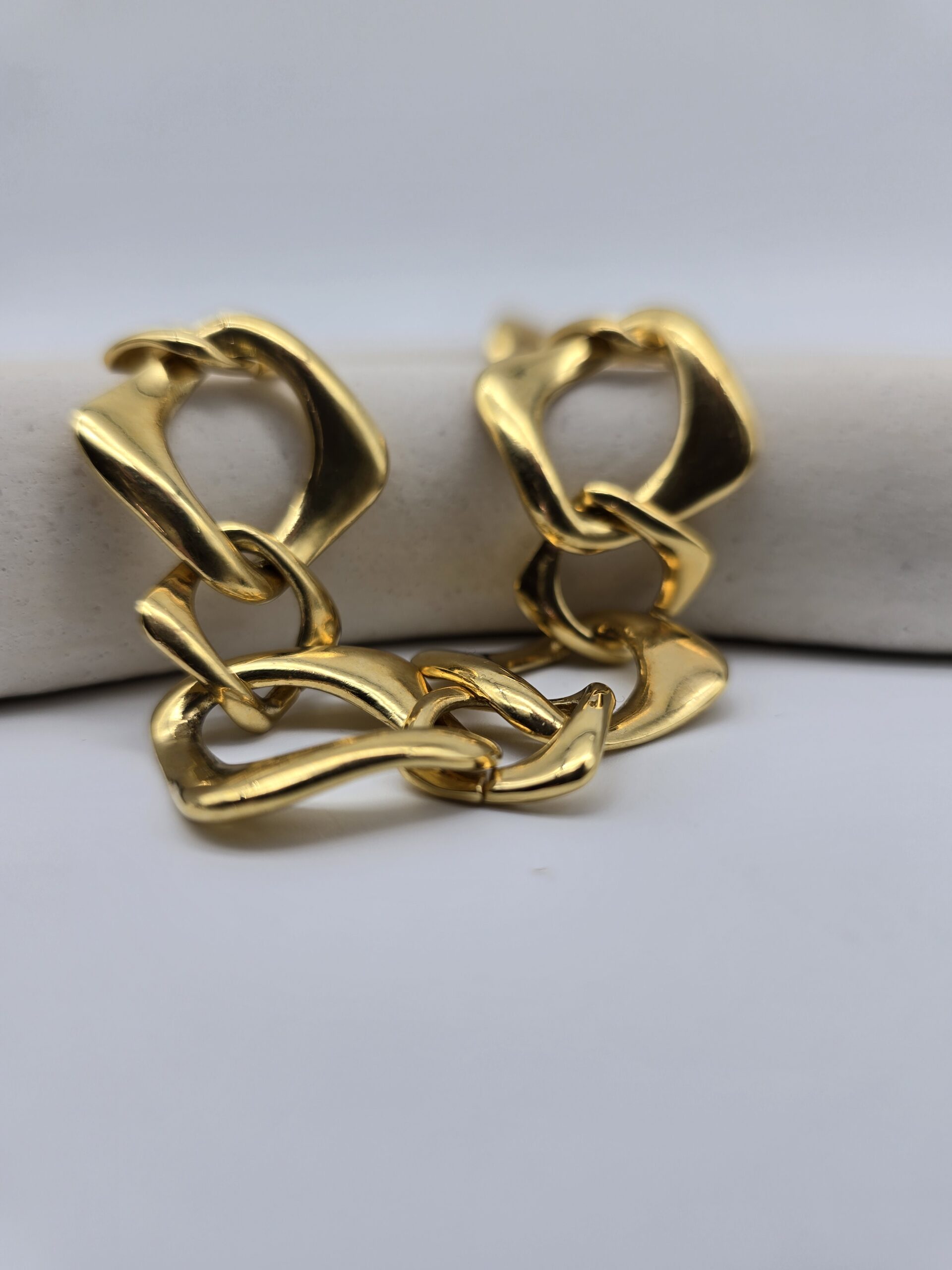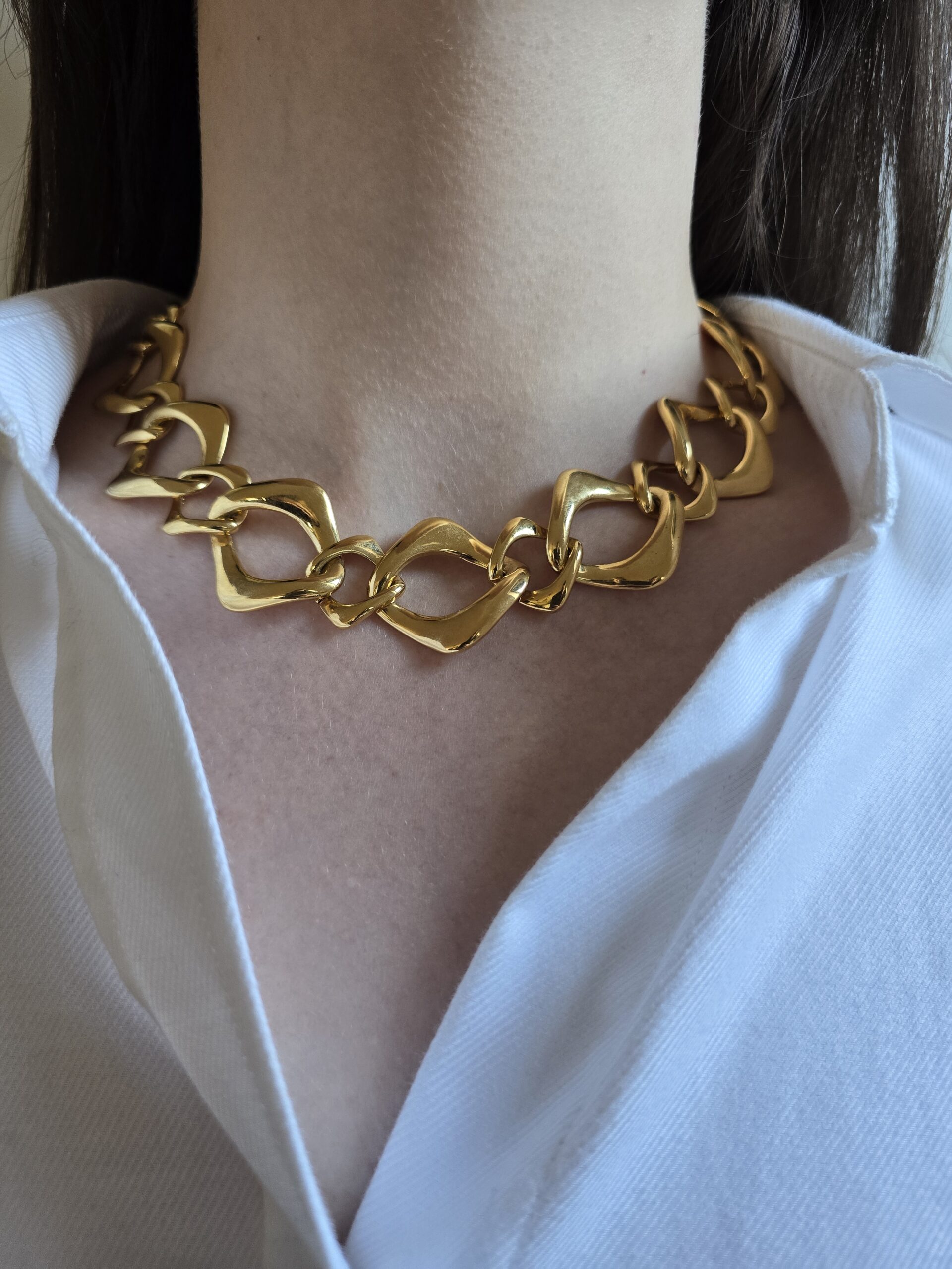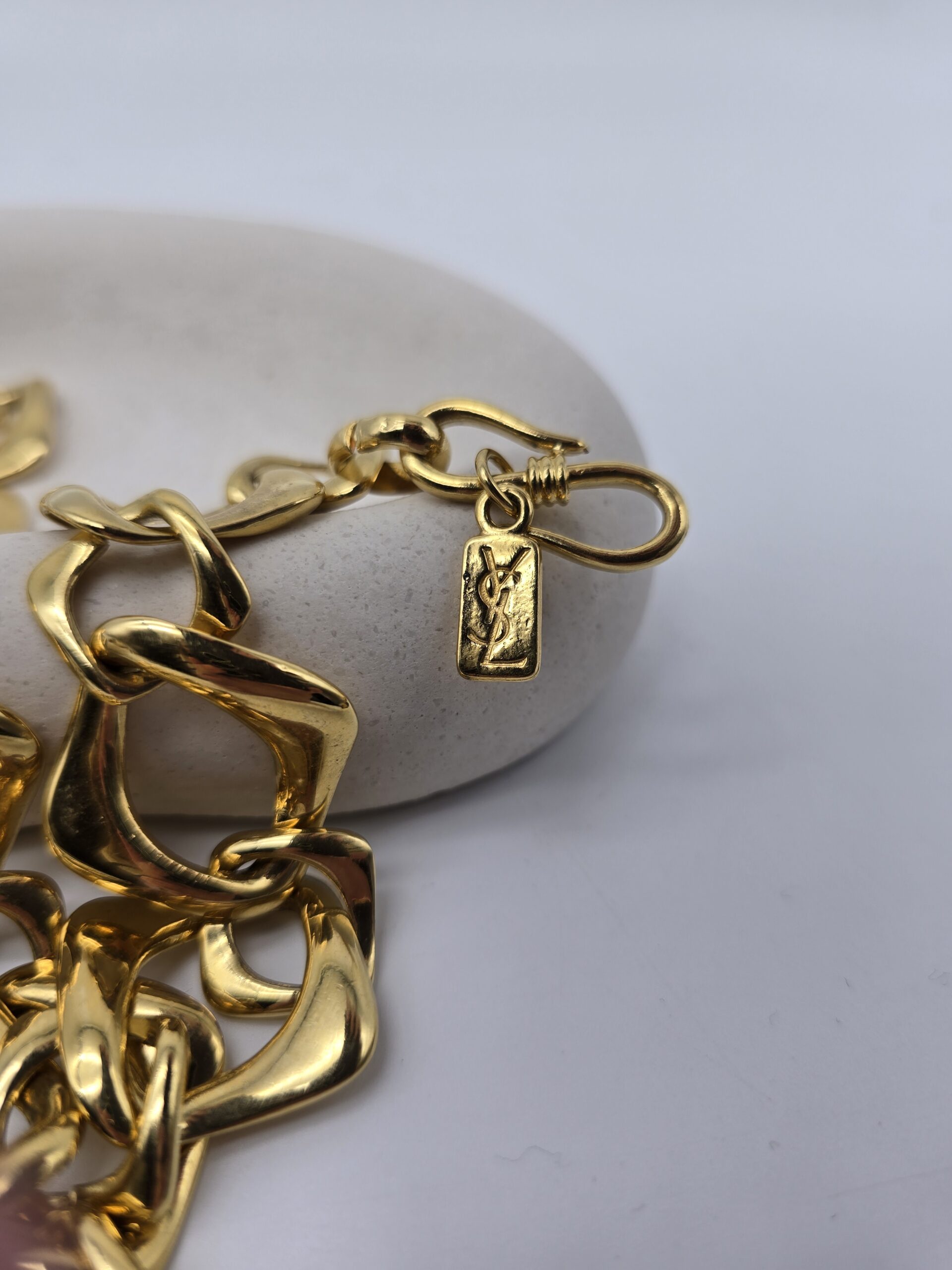 Zjawiskowy naszyjnik – łańcuch vintage sygnowany przez Yves Saint Laurent, wykonany z pozłacanego metalu nieszlachetnego. Charakterystyczne, geometryczne ogniwa tworzą efektowną całość, która przyciąga wzrok i podkreśla indywidualny styl. To propozycja dla kobiet, które cenią luksus i wyjątkowość w każdym detalu.