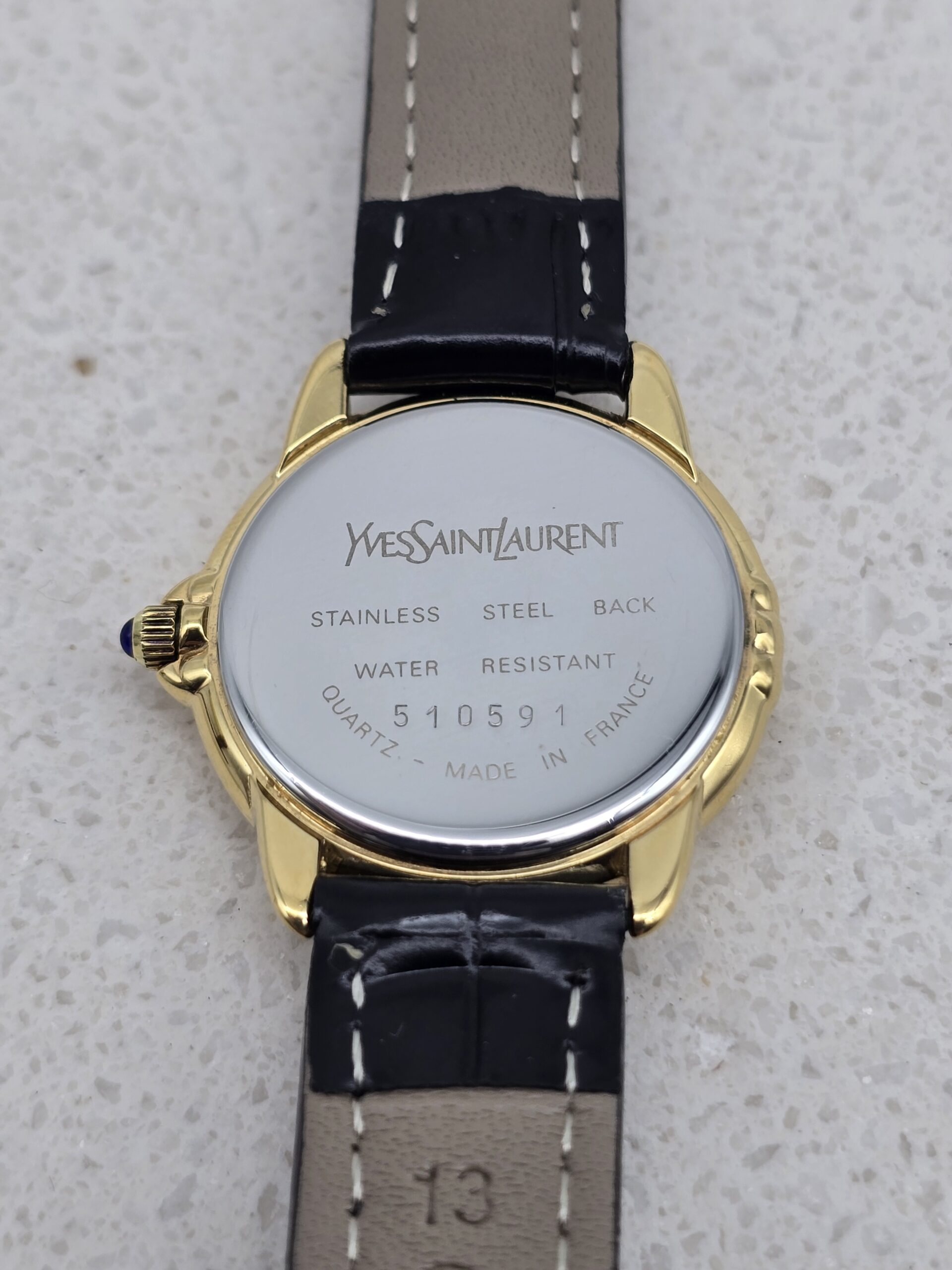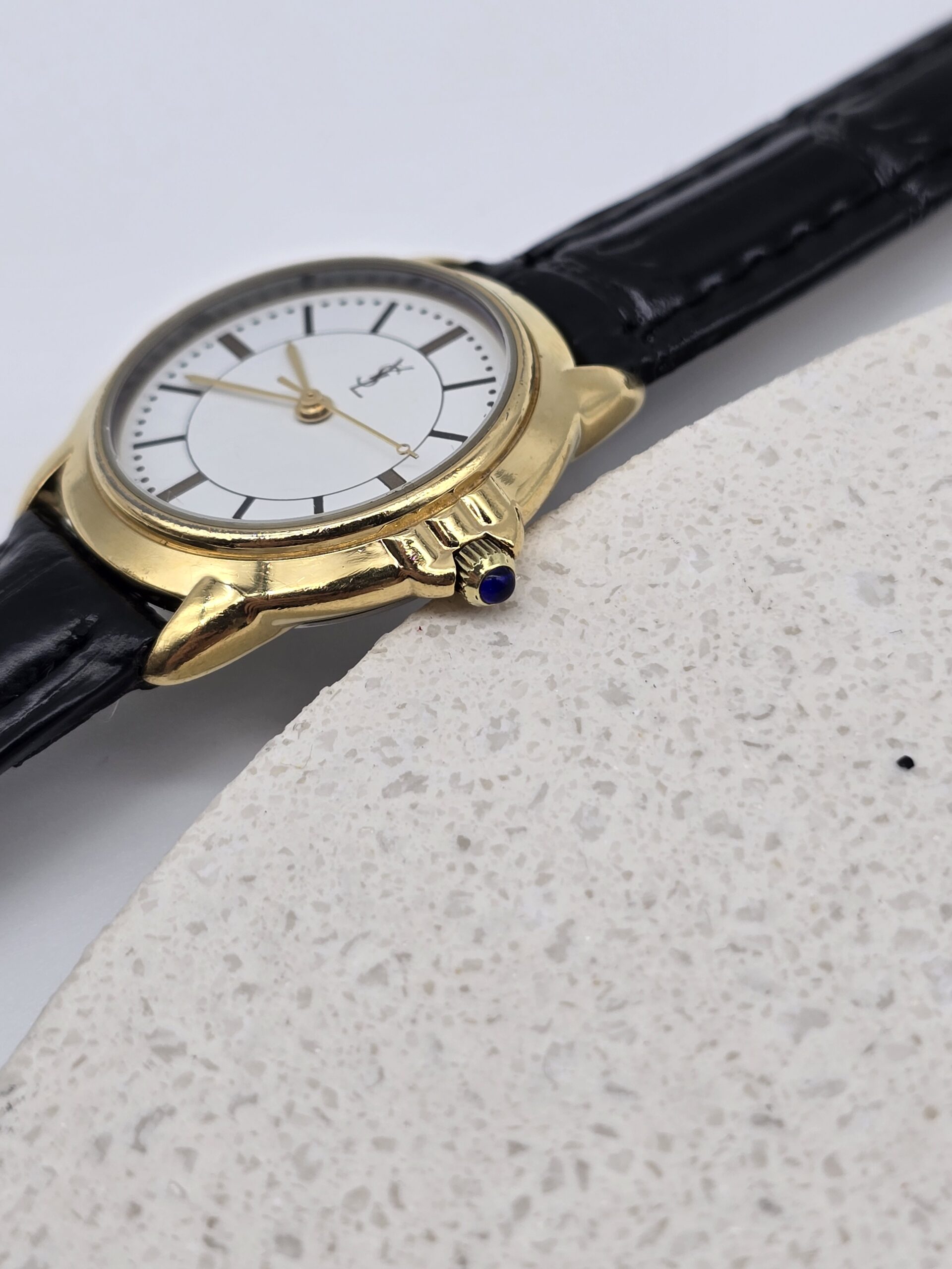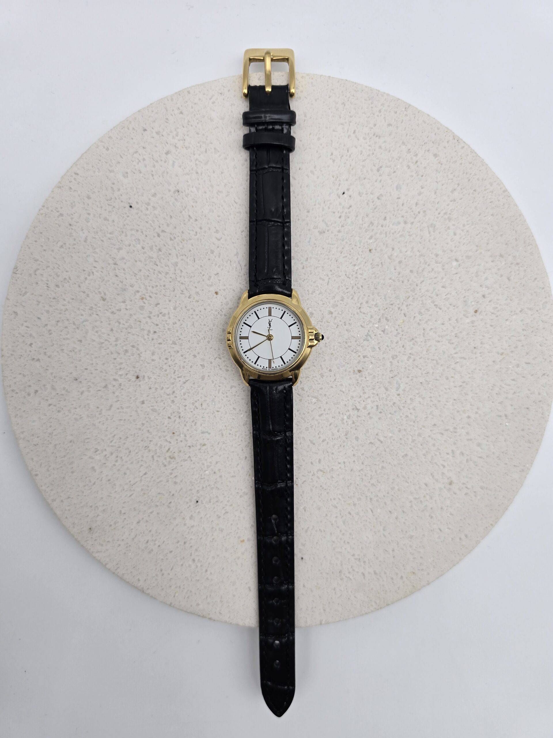 YVES SAINT LAURENT – złoty zegarek vintage na czarnym pasku