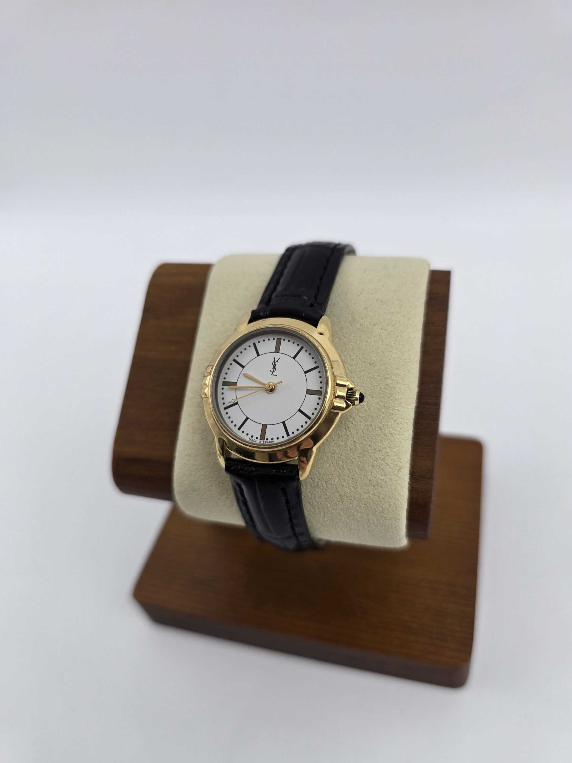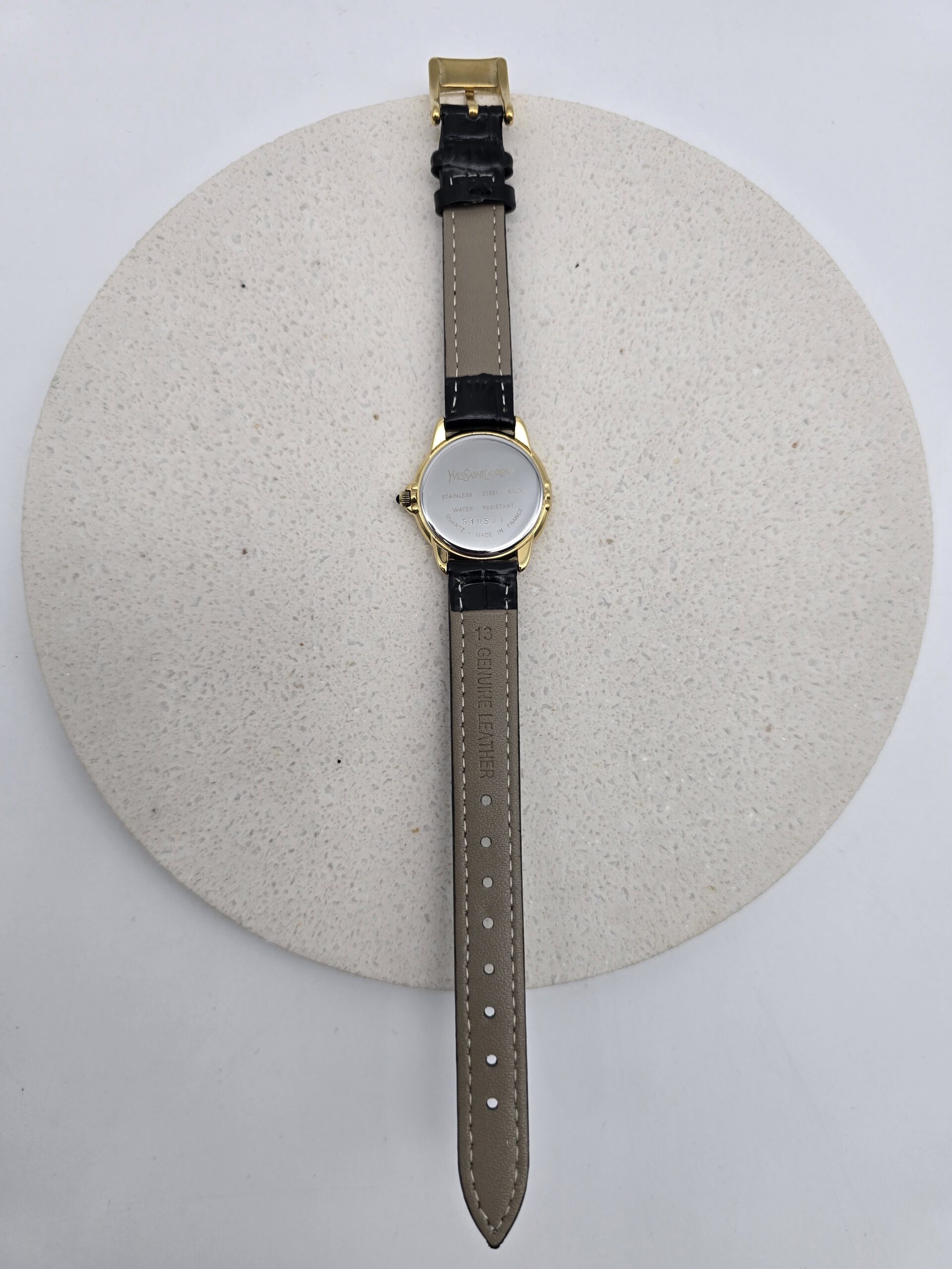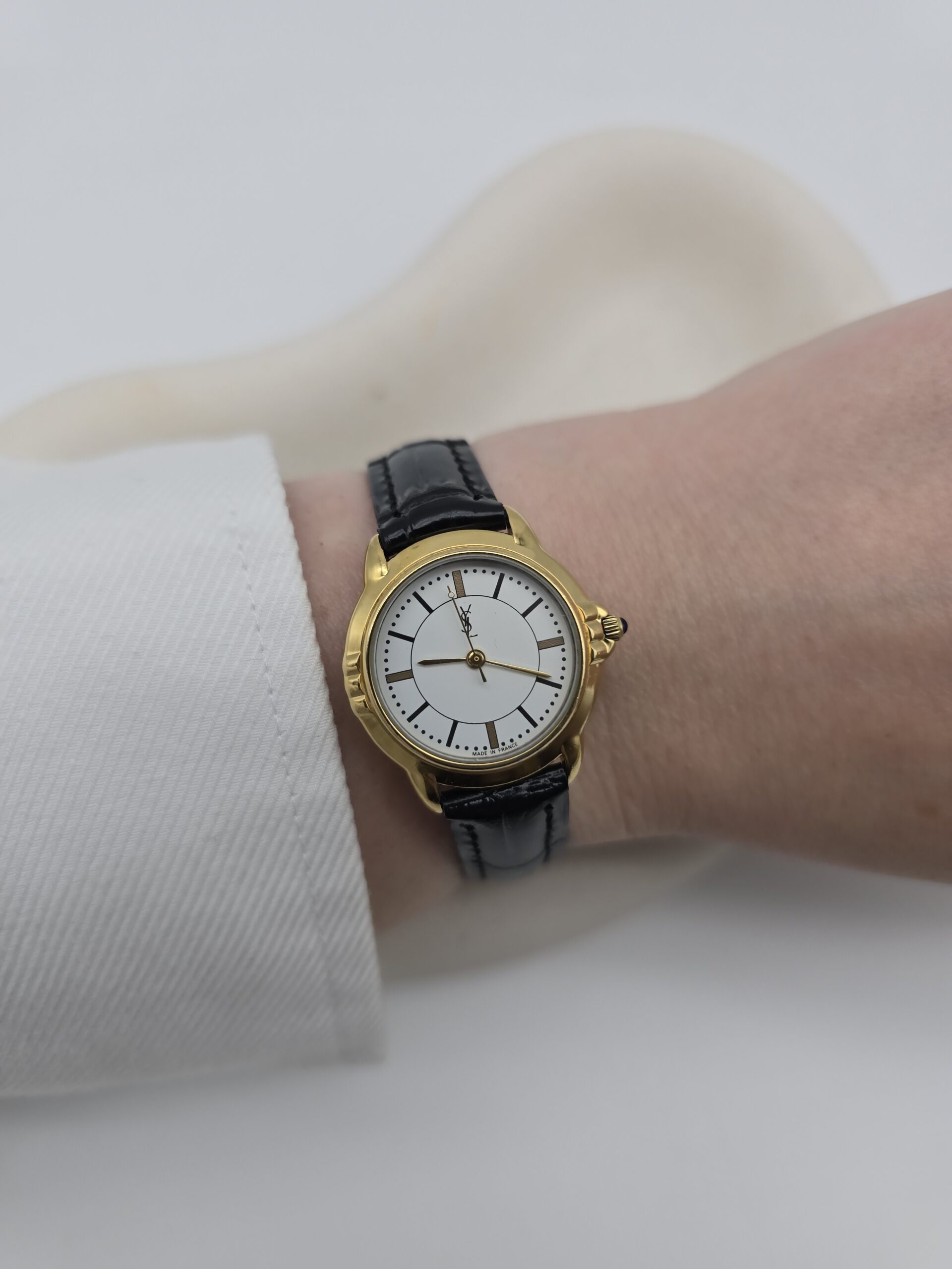YVES SAINT LAURENT – złoty zegarek vintage na czarnym pasku