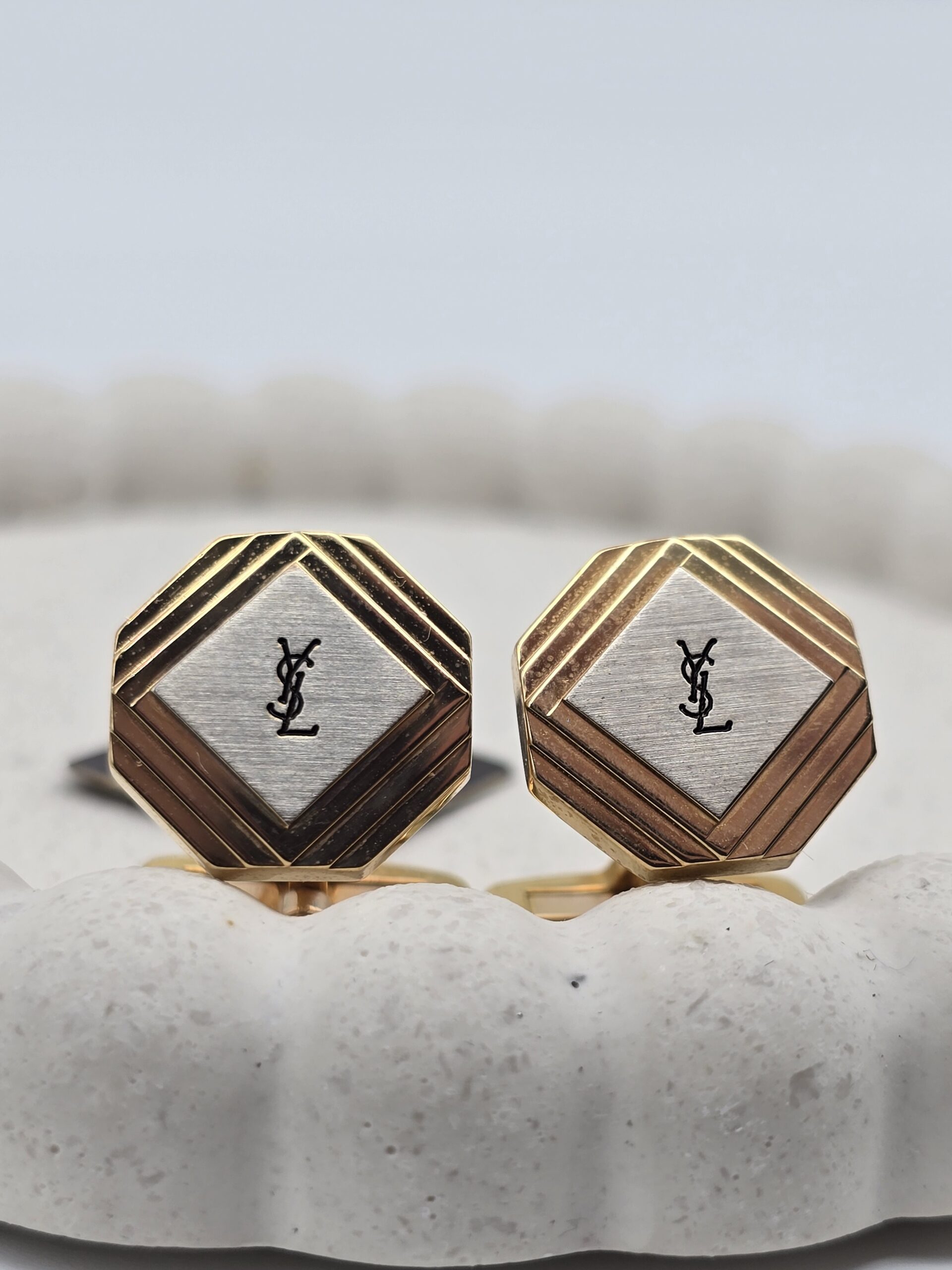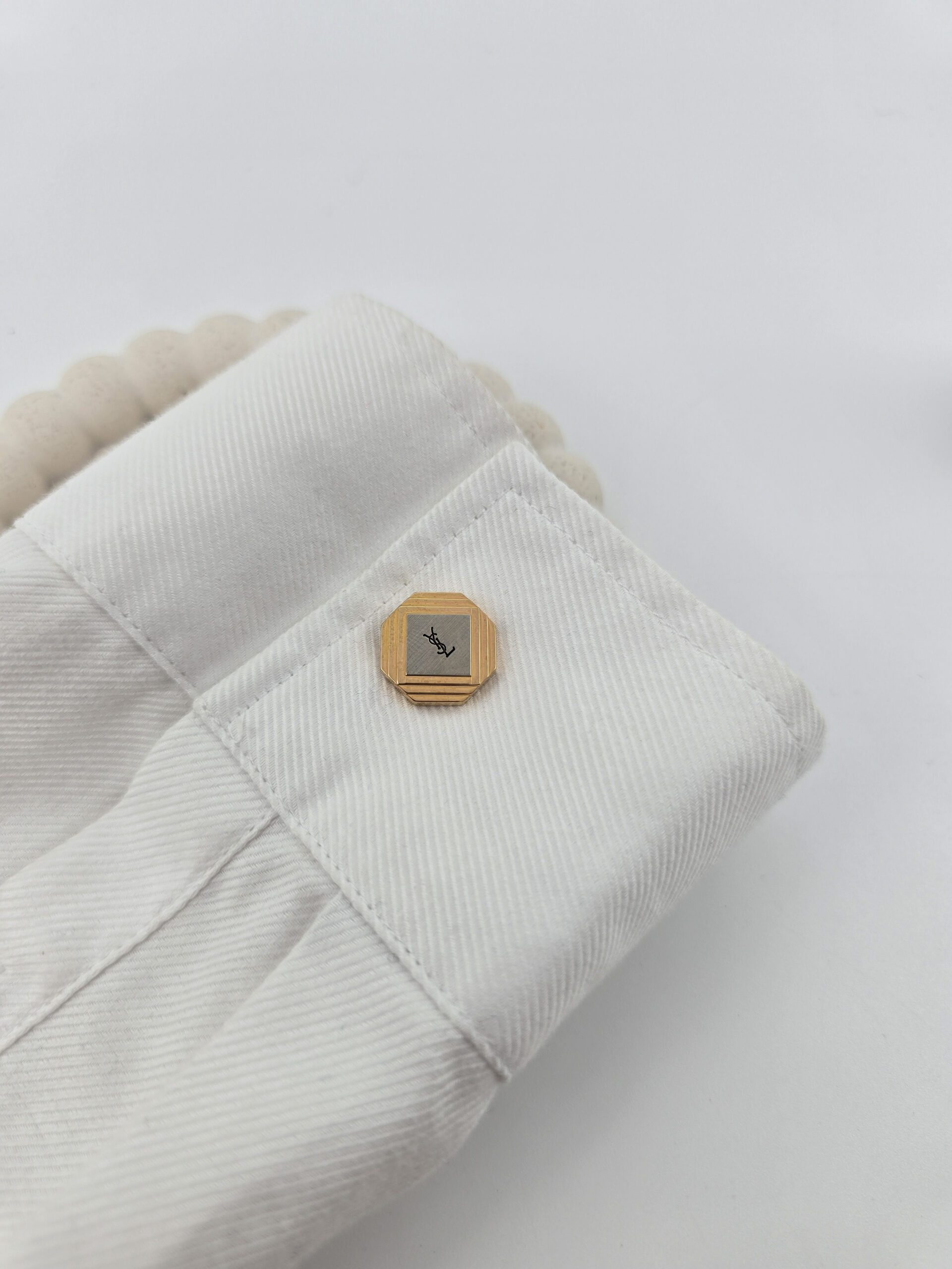 | Wyjątkowe spinki do mankietów YSL to kwintesencja francuskiego stylu i elegancji. Geometryczny, ośmiokątny kształt oraz połączenie stali z wyrafinowanym złoceniem sprawiają, że są to dodatki ponadczasowe, idealne zarówno do formalnych, jak i codziennych stylizacji.